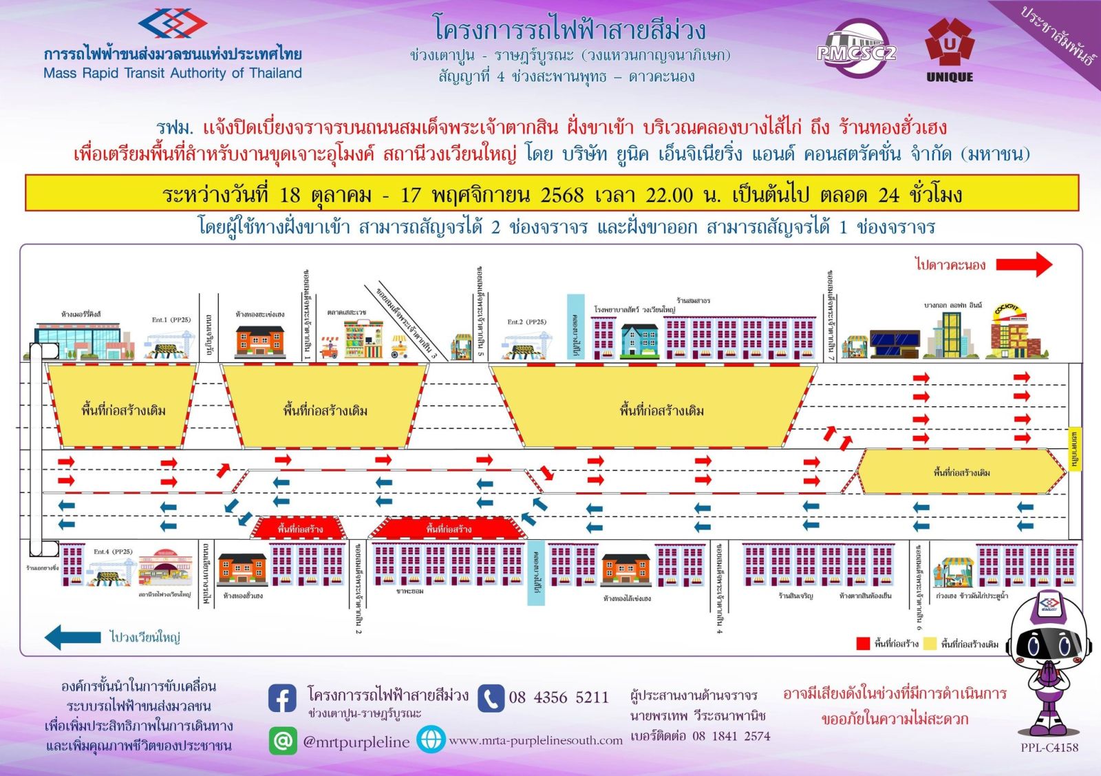 การรถไฟฟ้าขนส่งมวลชนแห่งประเทศไทย (รฟม.) แจ้งว่า บริษัท ยูนิค เอ็นจิเนียริ่ง แอนด์ คอนสตรัคชั่น จำกัด (มหาชน) ผู้รับจ้างงานออกแบบและก่อสร้างอุโมงค์ทางวิ่งและสถานีใต้ดิน โครงการรถไฟฟ้าสายสีม่วง ช่วงเตาปูน - ราษฎร์บูรณะ (วงแหวนกาญจนาภิเษก) สัญญาที่ 4 ช่วงสะพานพุทธ - ดาวคะนอง มีความจำเป็นต้องปิดเบี่ยงจราจรบนถนนสมเด็จพระเจ้าตากสิน ฝั่งขาเข้า บริเวณคลองบางไส้ไก่ ถึง ร้านทองฮั่วเฮง เพื่อเตรียมพื้นที่สำหรับงานขุดเจาะอุโมงค์ สถานีวงเวียนใหญ่ ระหว่างวันที่ 18 ตุลาคม - 17 พฤศจิกายน 2568 เวลา 22.00 น. เป็นต้นไป ตลอด 24 ชั่วโมง โดยผู้ใช้ทางฝั่งขาเข้าสามารถสัญจรได้ 2 ช่องจราจร เเละฝั่งขาออก สามารถสัญจรได้ 1 ช่องจราจร