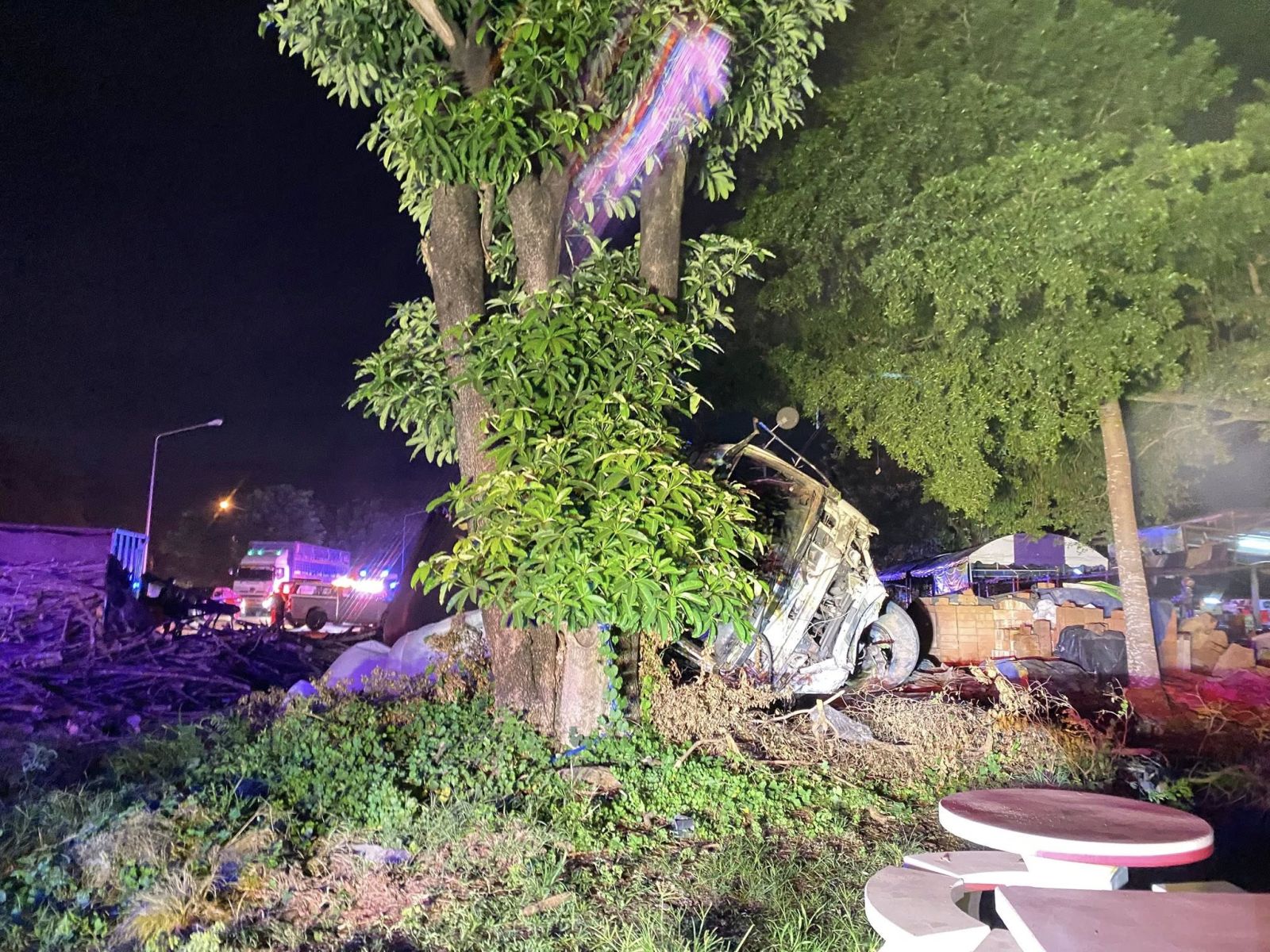ที่เกิดเหตุ พบรถบรรทุก 10 ล้อ พลิกตะแคงอยู่ข้างทาง และใกล้กันพบรถพ่วง ป้ายทะเบียน นครราชสีมา พลิกตะแคงและมีท่อนไม้ตกเกลื่อนถนน