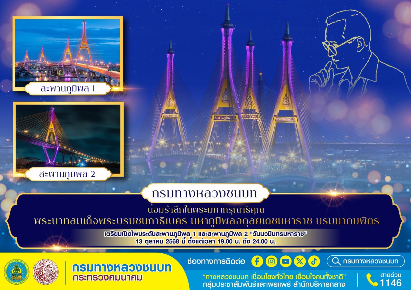 กรมทางหลวงชนบท น้อมรำลึกในพระมหากรุณาธิคุณพระบาทสมเด็จพระบรมชนกาธิเบศร มหาภูมิพลอดุลยเดชมหาราช บรมนาถบพิตร เตรียมเปิดไฟประดับสะพานภูมิพล 1 และสะพานภูมิพล 2 "วันนวมินทรมหาราช" 13 ตุลาคม 2568 นี้ ตั้งแต่เวลา 19.00 น. ถึง 24.00 น.