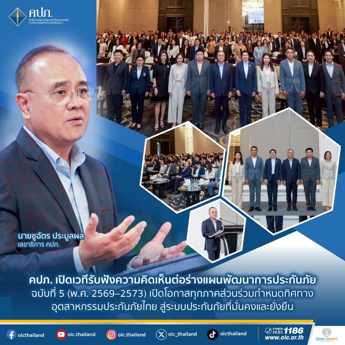 สำนักงานคณะกรรมการกำกับและส่งเสริมการประกอบธุรกิจประกันภัย (สำนักงาน คปภ.) จัดการประชุมรับฟังความคิดเห็น (Public Hearing) ต่อร่างแผนพัฒนาการประกันภัย ฉบับที่ 5 (พ.ศ. 2569–2573) เพื่อเปิดโอกาสให้ทุกภาคส่วนในอุตสาหกรรมประกันภัยได้มีส่วนร่วมในการกำหนดทิศทางอนาคตของอุตสาหกรรมประกันภัยไทยไปด้วยกัน โดยมีนายชูฉัตร ประมูลผล เลขาธิการ คปภ. เป็นประธานเปิดการประชุม เมื่อวันที่ 22 กันยายน 2568 ณ ห้องวิภาวดี บอลรูม โรงแรมเซ็นทารา แกรนด์ เซ็นทรัลพลาซา ลาดพร้าว กรุงเทพฯ
