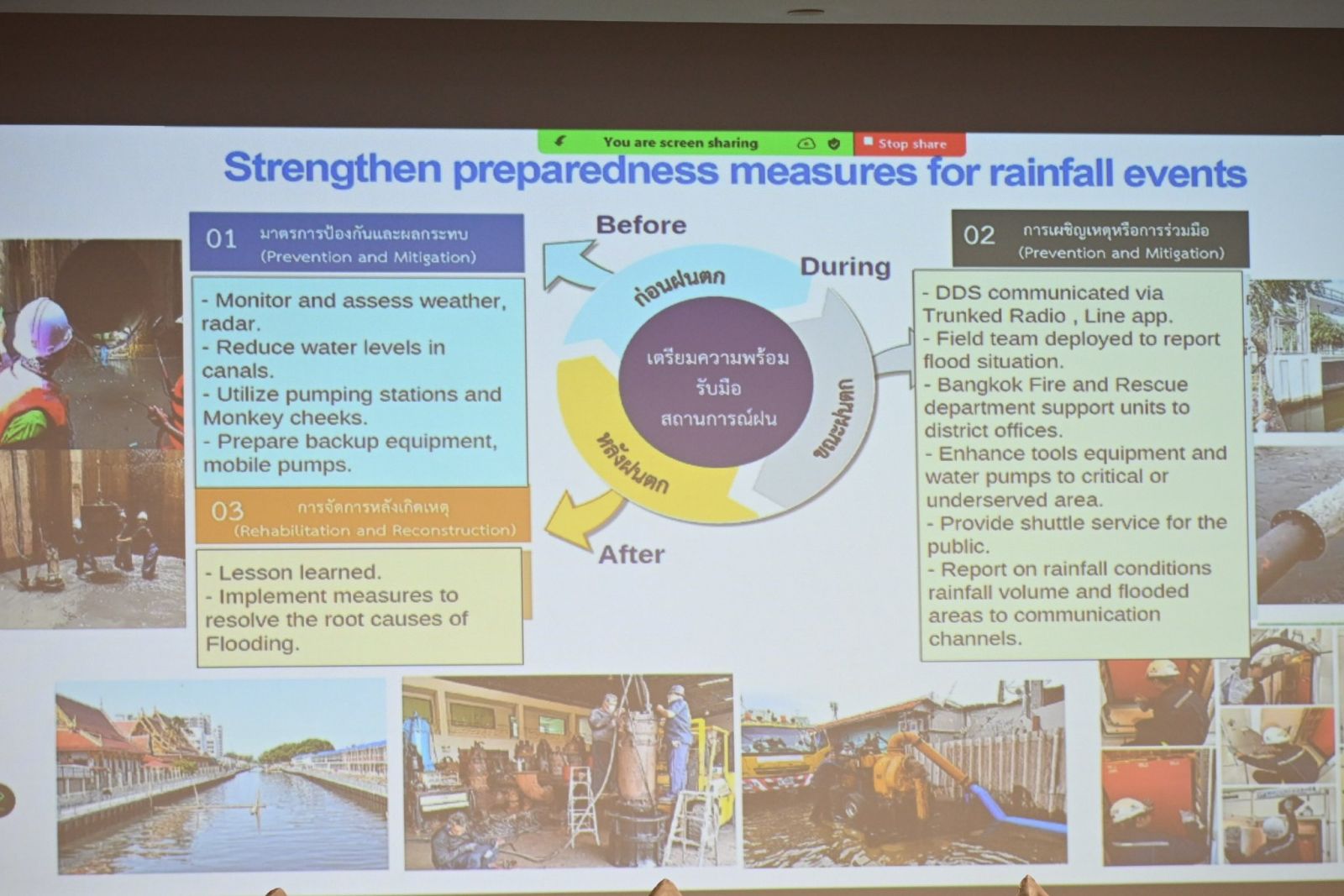 โดยรองผู้ว่าฯ ทวิดา ได้นำเสนอเรื่องการจัดการน้ำท่วมในพื้นที่ การแก้ไขจุดเสี่ยงน้ำท่วม ซึ่ง กทม. ประสบปัญหาน้ำท่วมเนื่องจากลักษณะทางภูมิประเทศ พร้อมเน้นย้ำถึงความสำคัญของการวางแผนที่ขับเคลื่อนด้วยข้อมูลเพื่อรับมือกับสถานการณ์น้ำท่วมด้วยการใช้เทคโนโลยี เช่น ระบบตรวจวัดน้ำท่วมบนถนน ระบบเรดาร์ และใช้ระบบ AI Nowcast สำหรับการพยากรณ์ฝนล่วงหน้า 3 ชั่วโมง และระบบอื่น ๆ ซึ่งล้วนเป็นระบบที่ประชาชนสามารถเข้าถึงได้