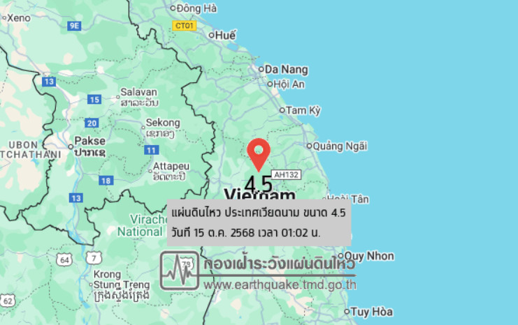 วันที่ 15 ต.ค. 2568 เวลา 01.02 น. กองเฝ้าระวังแผ่นดินไหว กรมอุตุนิยมวิทยา แจ้งเหตุแผ่นดินไหว ขนาด 4.5 ความลึก 10 กม. ภายในพื้นที่ของประเทศเวียดนาม (14.79°N,108.19°E) ศูนย์กลางห่างออกไปทางทิศตะวันออกเฉียงใต้ของ อ.เมือง จ.อุบลราชธานี ประมาณ 361 กม. ขณะนี้ยังไม่มีรายงานผลกระทบต่อประเทศไทย