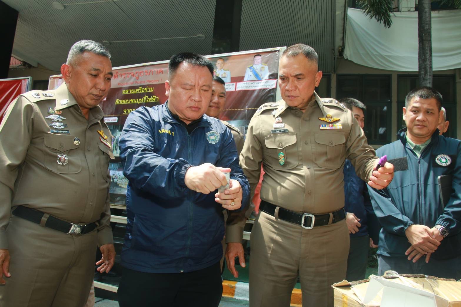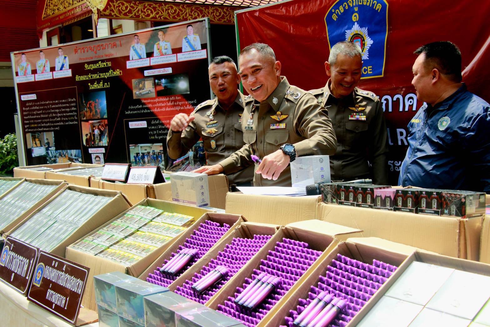 โดย พล.ต.ท.วัฒนา ยี่จีน ผบช.ภ.1 กล่าวว่า นายอนุทิน ชาญวีรกูล นายกรัฐมนตรี พล.ต.อ. กิตติรัฐ พันธุ์เพ็ชร์ ผบ.ตร. ได้สั่งการให้ตำรวจกวาดล้างจับกุมบุหรี่ไฟฟ้า เพื่อไม่ให้แพร่ระบาดแก่เยาวชน โดยก่อนหน้านี้เมื่อวันที่ 28 ก.ย.68 เจ้าหน้าที่ตำรวจสืบสวนภาค 1 ได้จับกุมตัวนายตา (นามสมมุติ) อายุ 31 ปี พร้อมของกลาง บุหรี่ไฟฟ้า จำนวน 4,476 ชิ้น รวมมูลค่าประมาณ 3,088,440 บาท ได้ที่แยกไฟแดงนิคมสร้างตนเอง ต.นิคมสร้างตนเอง อ.เมือง จ.ลพบุรี และได้ขยายผลเพื่อติดตามจับกุมขบวนการลักลอบขนบุหรี่ไฟฟ้าเข้ามาจำหน่ายพื้นที่ภาคกลาง ซึ่งขบวนการนี้ขนลำเลียงมาจากภาคใต้
