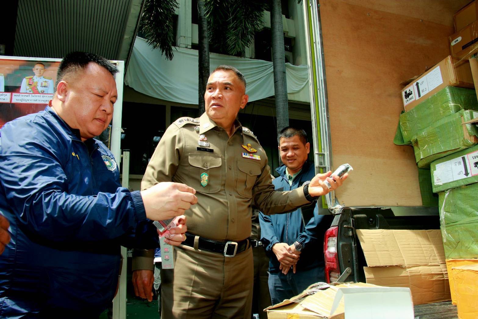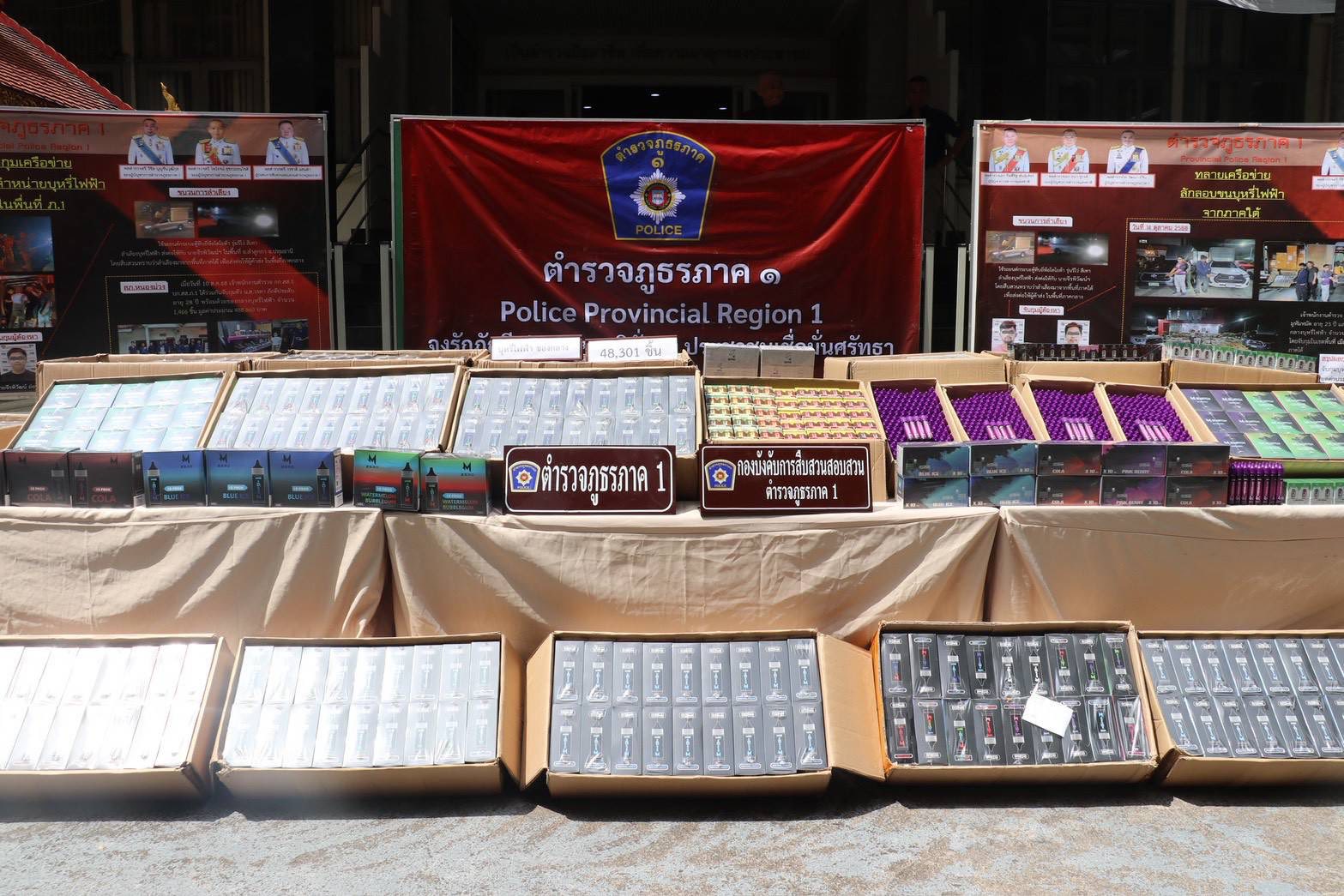 ที่ บช.ภ.1 พล.ต.ท.วัฒนา ยี่จีน ผบช.ภ.1 , พล.ต.ต.วิชิต บุญชินวุฒิกุล รอง ผบช.ภ.1 , พล.ต.ต.วรชาติ แสนคำ ผบก.สส.ภ.1 , พ.ต.อ.พูนสุข เตชะประเสริฐ์พร ผกก.1 บก.สส.ภ.1 ร่วมกันแถลงข่าวจับกุม นายมู (นามสมมุติ) อายุ 23 ปี และนายอู (นามสมมุติ) อายุ 28 ปี พร้อมของกลาง บุหรี่ไฟฟ้า จำนวน 48,301 ชิ้น รถกระบะโตโยต้า 2 คัน โทรศัพท์มือถือ 4 เครื่อง
