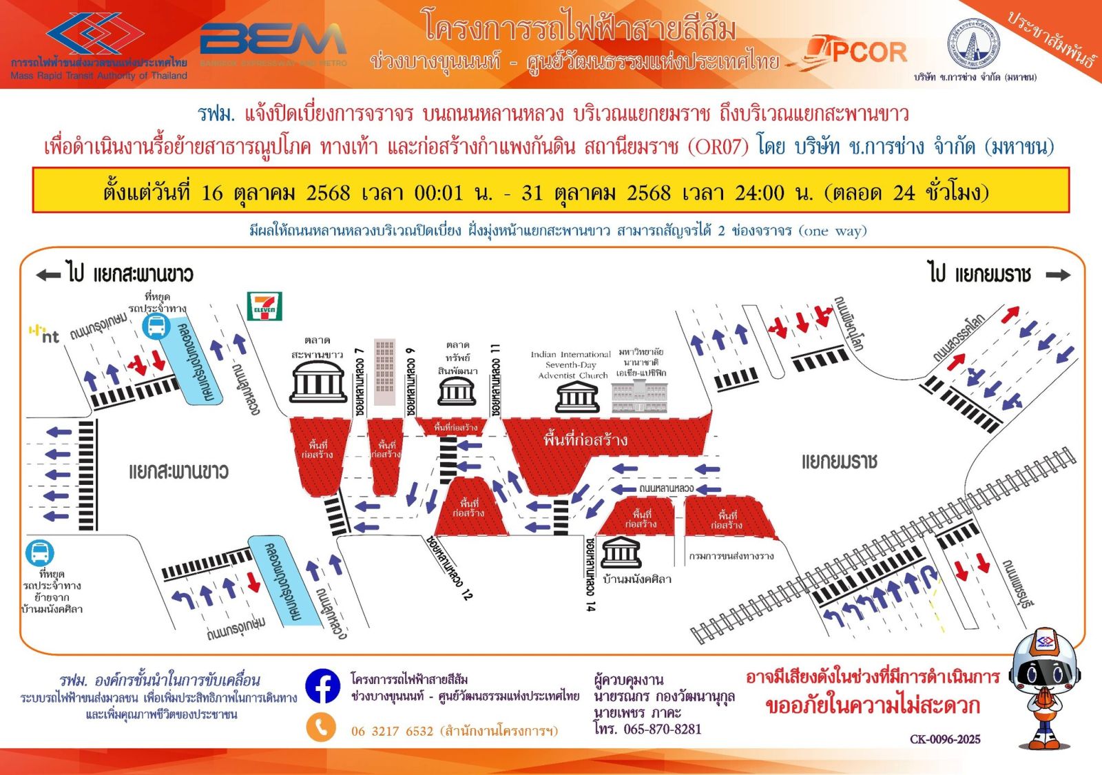 ประชาสัมพันธ์แจ้งปิดเบี่ยงการจราจร บนถนนหลานหลวง บริเวณแยกยมราชถึงบริเวณแยกสะพานขาว เพื่อดำเนินงานรื้อย้ายสาธารณูปโภค ทางเท้า และก่อสร้างกำแพงกันดิน สถานียมราช (OR07) โครงการรถไฟฟ้าสายสีส้ม ช่วงบางขุนนนท์ -ศูนย์วัฒนธรรมแห่งประเทศไทย ตั้งแต่วันที่ 16 ตุลาคม 2568 เวลา 00:01 น. – 31 ตุลาคม 2568 เวลา 24:00 น. (ตลอด 24 ชั่วโมง) มีผลให้ถนนหลานหลวงบริเวณปิดเบี่ยง ฝั่งมุ่งหน้าแยกสะพานขาว สามารถสัญจรได้ 2 ช่องจราจร (One way) โดยประชาชนสามารถเข้า – ออกที่พักอาศัยได้ตามปกติ