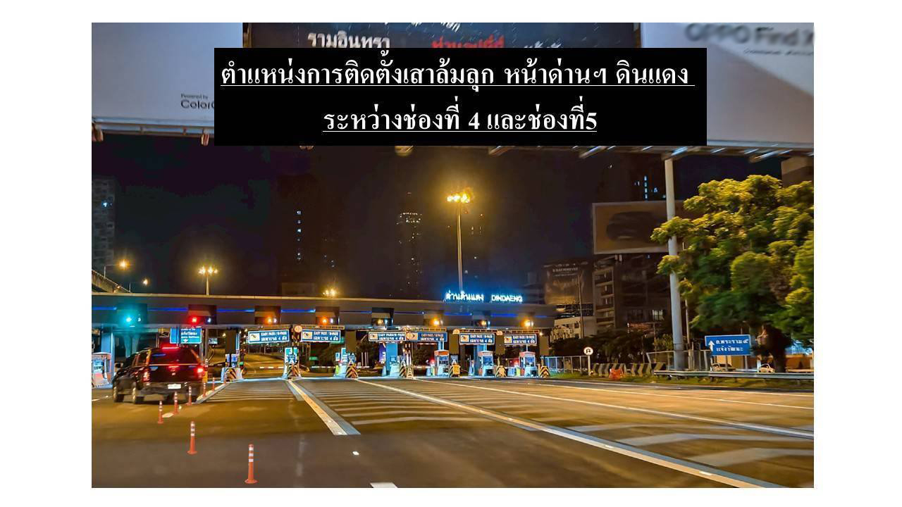 กทพ. จึงได้ดำเนินการติดตั้งเสาล้มลุกบริเวณหน้าด่านฯ ดินแดง ทางพิเศษเฉลิมมหานคร ระหว่างช่องที่ 4 และช่องที่ 5 เป็นระยะทาง 65 เมตร ระยะห่างแต่ละเสา 1 เมตร ตามแนวเครื่องหมายจราจรบนพื้นทาง Cheron Hatching สีฟ้า โดยเว้นระยะเสาต้นแรกจากตุ้มหน้าด่านฯ เป็นระยะทาง 5 เมตร เพื่อแก้ปัญหาจราจรติดขัดท้ายแถวคอยของรถในช่องเงินสดมาเบียดแทรกรถผู้ใช้บริการที่จะเข้าช่อง Easy Pass