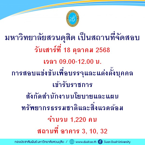 วันเสาร์ที่ 18 ตุลาคม 2568 ตั้งแต่เวลา 09.00 - 12.00 น. มหาวิทยาลัยสวนดุสิต เป็นสถานที่จัดสอบแข่งขันเพื่อบรรจุและแต่งตั้งเข้ารับราชการ สังกัดสำนักงานนโยบายและแผนทรัพยากรธรรมชาติและสิ่งแวดล้อม จำนวน 1,220 คน