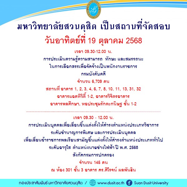 ส่วนในวันอาทิตย์ที่ 19 ตุลาคม 2568 มหาวิทยาลัยสวนดุสิต เวลา 09.30 -12.00 น.