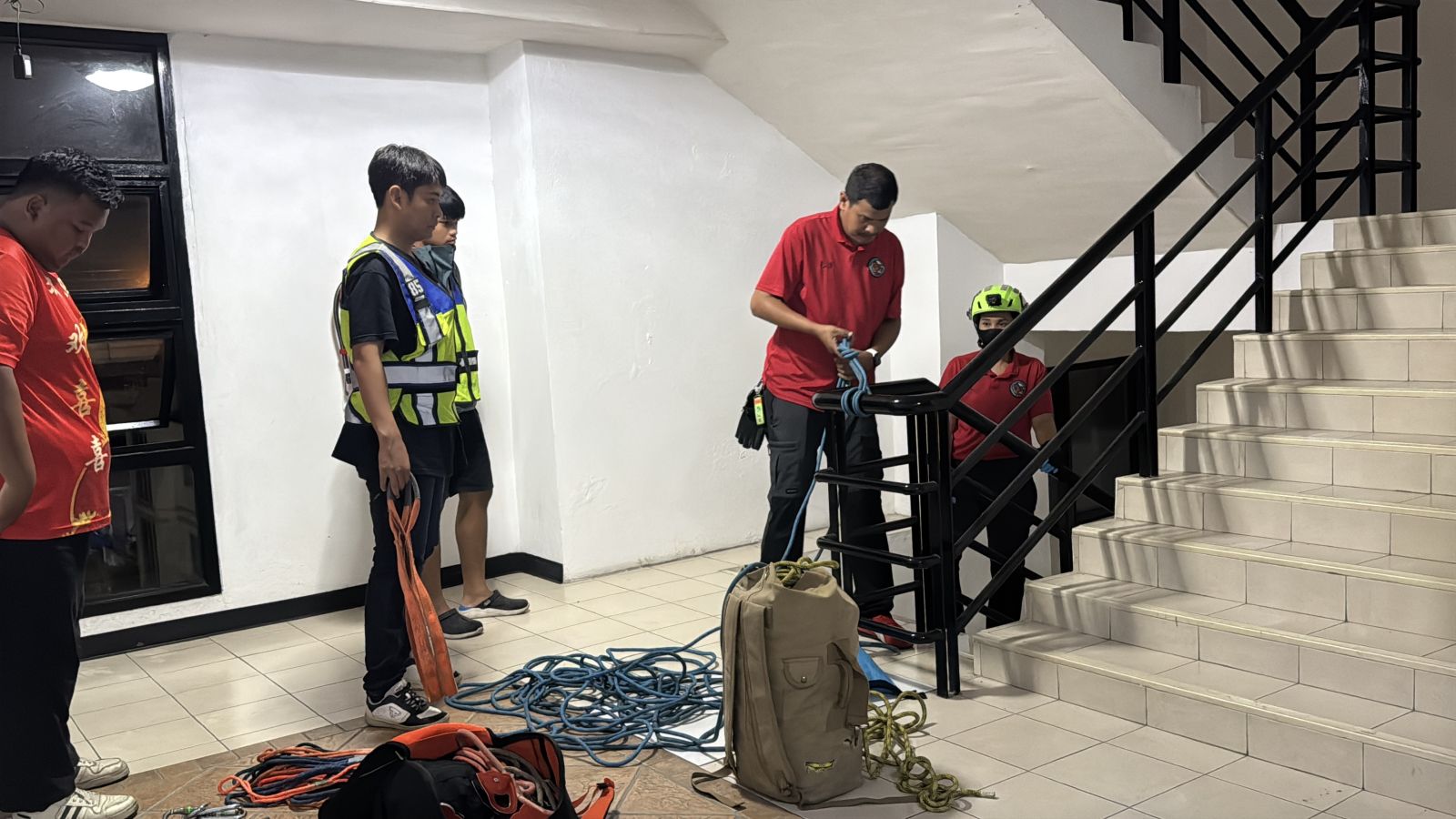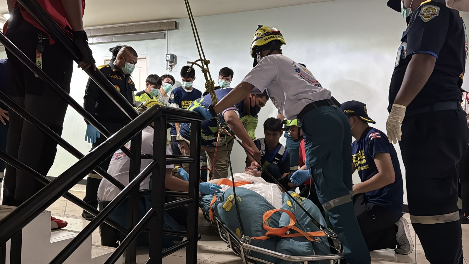 ที่เกิดเหตุเหตุเป็นอาคารสูง 8 ชั้น ผู้ป่วยพักอาศัยอยู่ที่ชั้น 5 เจ้าหน้าที่กู้ภัยได้ประเมินอาการผู้ป่วยและลิฟต์เพื่อนำผู้ป่วยลง แต่จากการตรวจสอบไม่สามารถนำผู้ป่วยลงทางลิฟต์ได้ ต้องใช้วิธีนำผู้ป่วยใส่กระเช้าเหล็กโรยตัวจากทางบันไดภายในอาคารลงมายังชั้นล่าง