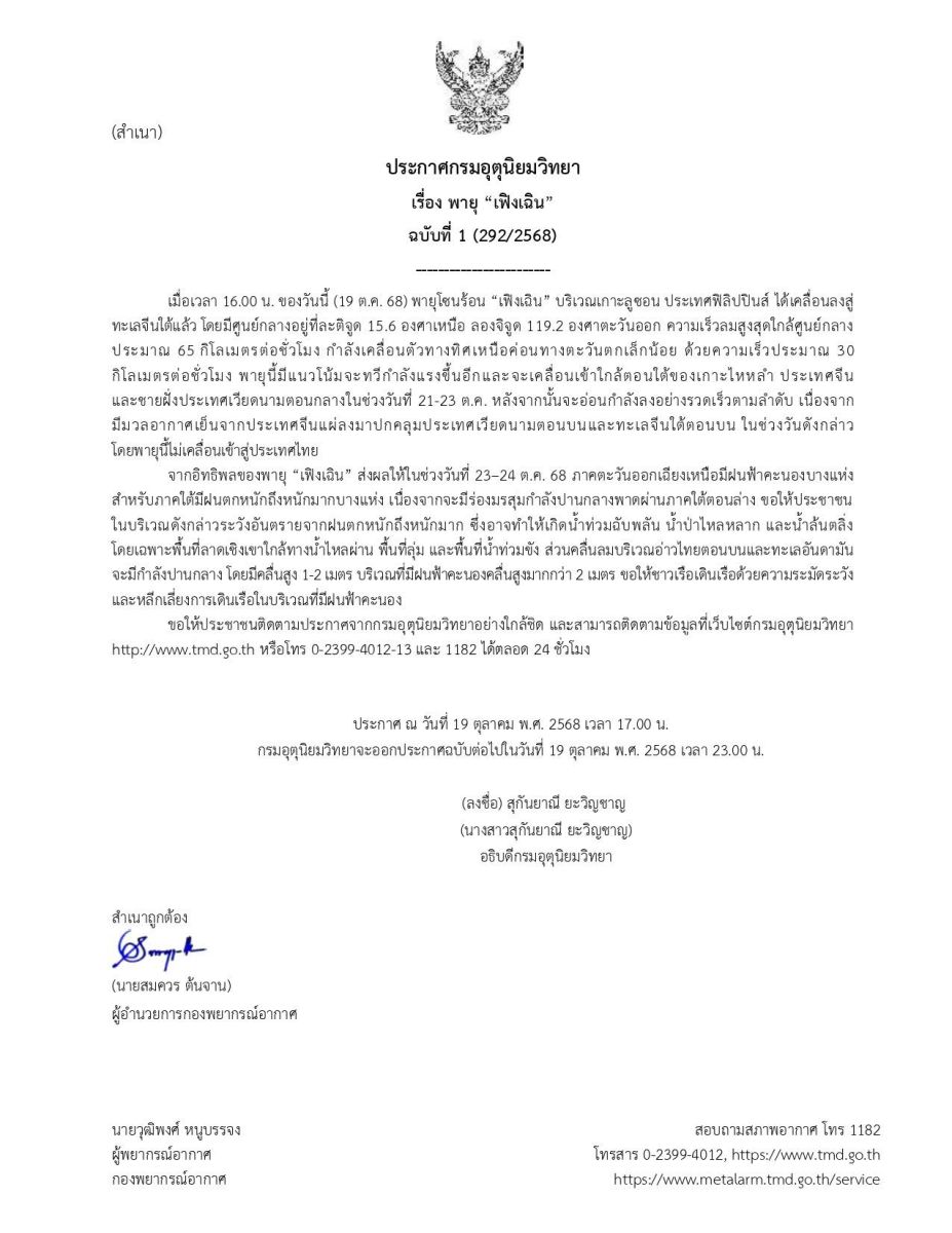 กรมอุตุนิยมวิทยา ออกประกาศเตือน พายุโซนร้อนกำลังแรง "เฟิงเฉิน" ซึ่งกำลังเคลื่อนตัวขึ้นสู่ทะเลจีนใต้ตอนบนในวันนี้ (19 ต.ค. 68) โดยเมื่อเวลา 16.00 น. ศูนย์กลางของพายุอยู่บริเวณละติจูด 15.6 องศาเหนือ ลองจิจูด 119.2 องศาตะวันออก พายุมีความเร็วลมสูงสุดใกล้ศูนย์กลางประมาณ 65 กิโลเมตรต่อชั่วโมง กำลังเคลื่อนตัวไปทางทิศตะวันตกเล็กน้อย ด้วยความเร็วประมาณ 30 กิโลเมตรต่อชั่วโมง