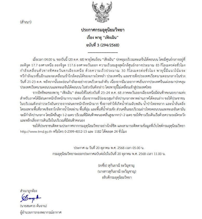 ประกาศ ณ วันที่ 20 ตุลาคม พ.ศ. 2568 เวลา 05.00 น.