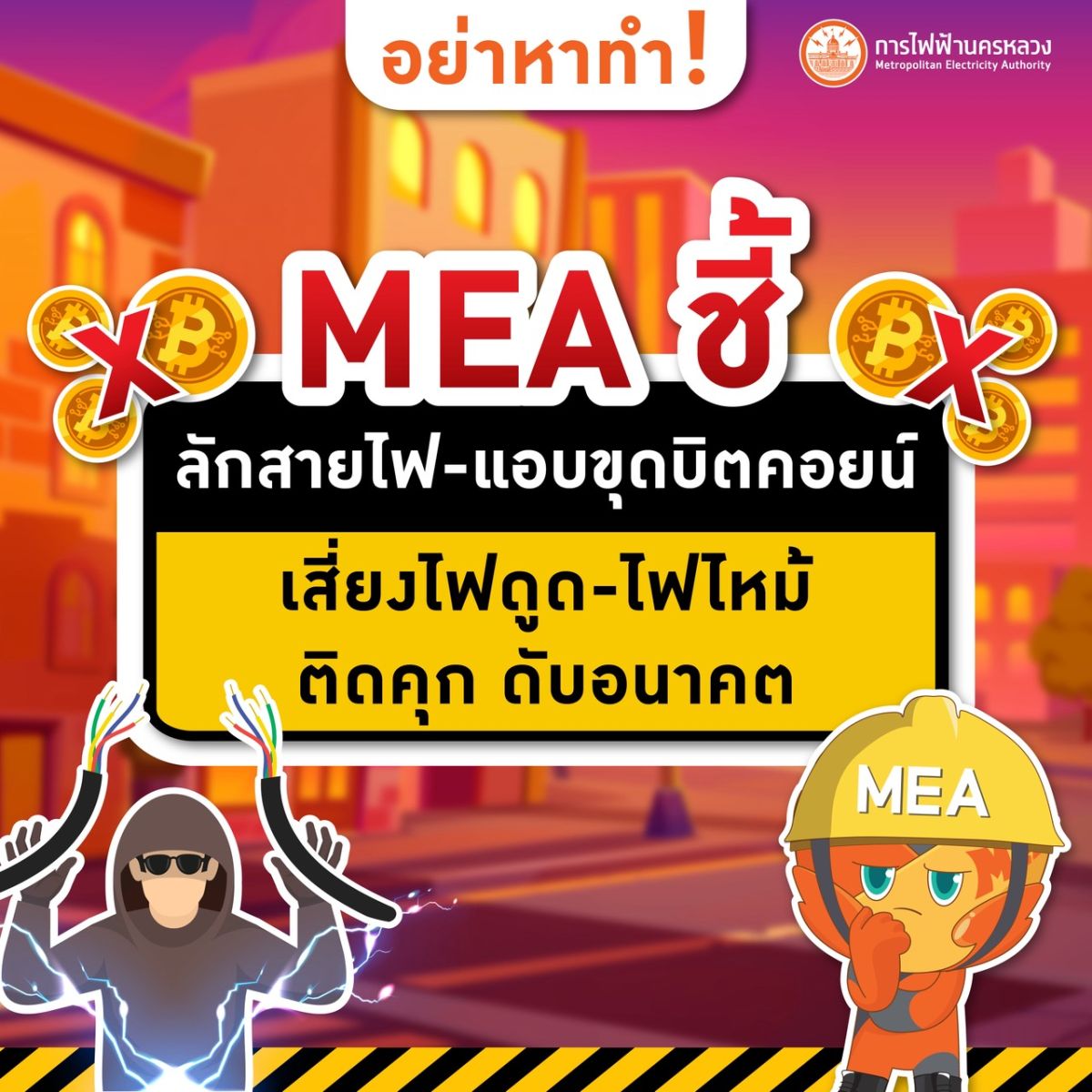 MEA หรือการไฟฟ้านครหลวง เตือนภัยพฤติกรรมสุดอันตราย ที่กำลังสร้างความเสียหายทั้งชีวิตและทรัพย์สิน หลังพบการลักลอบตัดสายไฟฟ้า แอบพ่วงไฟขุดบิตคอยน์ และดัดแปลงมิเตอร์ไฟฟ้าเพิ่มขึ้นอย่างต่อเนื่อง โดยการกระทำดังกล่าว ไม่เพียงแต่เป็นการกระทำที่ผิดกฎหมาย มีโทษทั้งจำทั้งปรับ แต่ยังเป็นการนำตัวเองเข้าไปอยู่ในความเสี่ยงสูงสุด เพราะอาจเกิดอันตรายจากกระแสไฟฟ้าแรงสูง หรือเกิดไฟฟ้าลัดวงจรจนเป็นเหตุให้เกิดเพลิงไหม้ รวมถึงทำให้ระบบจำหน่ายไฟฟ้าขัดข้อง เกิดไฟดับเป็นบริเวณวงกว้าง ส่งผลกระทบต่อผู้ใช้ไฟฟ้าจำนวนมาก และยังทำลายทรัพย์สินสาธารณะที่เป็นของ MEA