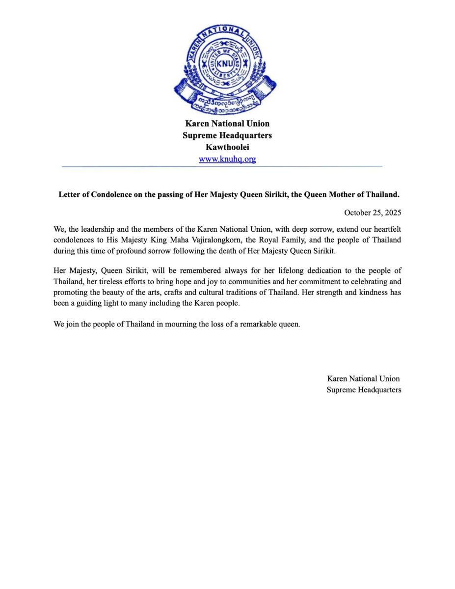 เมื่อวันที่ 25 ตุลาคม 2568 กองบัญชาการสหภาพแห่งชาติกะเหรี่ยง KNU ได้ประกาศส่งหนังสือแสดงความเสียใจต่อการเสด็จสวรรคตของสมเด็จพระนางเจ้าสิริกิติ์ พระบรมราชินีนาถ พระบรมราชชนนีพันปีหลวง ออกโดยกองบัญชาการสหภาพแห่งชาติกะเหรี่ยง KNU ใจความว่า "พวกเรา คณะผู้นำและสมาชิกแห่งสหภาพแห่งชาติกะเหรี่ยง ขอแสดงความเสียใจอย่างสุดซึ้งต่อพระบาทสมเด็จพระวชิรเกล้าเจ้าอยู่หัว พระบรมวงศานุวงศ์ทุกพระองค์ และประชาชนชาวไทยทุกคน ต่อการเสด็จสวรรคตของ สมเด็จพระนางเจ้าสิริกิติ์ พระบรมราชินีนาถ พระบรมราชชนนีพันปีหลวง จะทรงเป็นที่จดจำตลอดไปในฐานะพระราชินีผู้ทรงอุทิศพระวรกายเพื่อพสกนิกรชาวไทย ทรงบำเพ็ญพระราชกรณียกิจอย่างไม่รู้เหน็ดเหนื่อยเพื่อสร้างความหวังและความสุขให้กับชุมชนและทรงมุ่งมั่นส่งเสริมความงดงามของศิลปหัตถกรรมและวัฒนธรรมไทยให้คงอยู่สืบไป