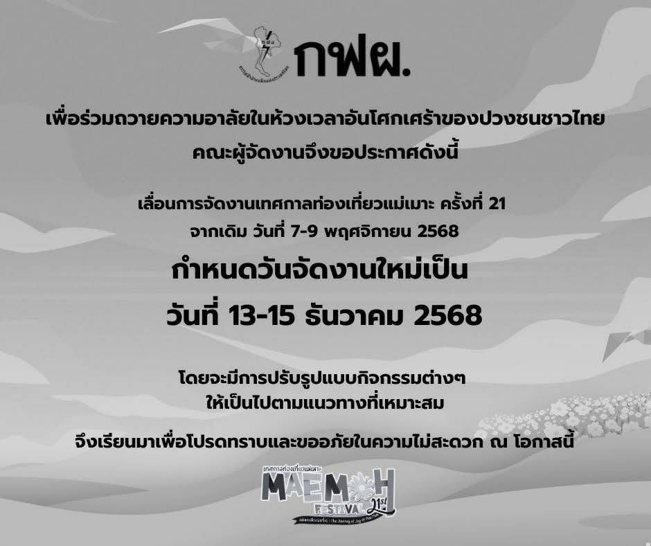 การไฟฟ้าฝ่ายผลิตแห่งประเทศไทย (กฟผ.) ขอเลื่อนจัดงานเทศกาลท่องเที่ยงแม่เมาะครั้งที่ 21 ประจำปี 2568 จากเดิมกำหนดจัดวันที่ 7 – 9 พฤศจิกายน 2568 เป็นวันที่ 13 – 15 ธันวาคม 2568 ณ กฟผ. แม่เมาะ อ.แม่เมาะ จ.ลำปาง โดยจะปรับรูปแบบกิจกรรมตามความเหมาะสม เพื่อร่วมถวายความอาลัยและสำนึกใน พระมหากรุณาธิคุณอันหาที่สุดมิได้ของสมเด็จพระนางเจ้าสิริกิติ์ พระบรมราชินีนาถ พระบรมราชชนนีพันปีหลวง