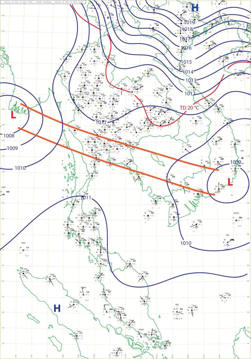 ยังมีศูนย์กลางอยู่บริเวณตอนกลางของประเทศฟิลิปปินส์ กำลังเคลื่อนตัวทางตะวันตกที่คาดว่าจะเคลื่อนลงสู่ทะเลจีนใต้ ช่วงรอยต่อระหว่างคืนวันที่ 4 ถึงเช้าวันที่ 5 พ.ย.68 และจะเคลื่อนตัวขึ้นฝั่งประเทศเวียดนามตอนกลางช่วง 6-7 พ.ย.68 หลังจากนั้นจะอ่อนกำลังลงตามลำดับ และสลายตัวเป็นหย่อมความกดอากาศต่ำกำลังแรงก่อนเคลื่อนเข้าปกคลุมประเทศไทยตอนบน โดยจะเริ่มทางภาคอีสานก่อน (จ.อุบลราชธานี) ในวันที่ 7 พ.ย.68 ถึงแม้จะอ่อนกำลังลงเป็นหย่อมความกดอากาศต่ำแล้วก็ตาม แต่ยังมีโอกาสทำให้ประเทศไทยตอนบนมีเมฆฝนเพิ่มขึ้นและมีฝนตกหนักหลายพื้นที่ โดยเฉพาะบริเวณภาคอีสาน (จ.อุบลราชธานี ศรีสะเกษ อำนาจเจริญ ยโสธร) ส่วนภาคอื่นๆ จะได้รับผลกระทบในวันถัดไป โดยจะยังต้องติดตามและประเมินเป็นระยะๆ เนื่องจากทิศทางและกำลังของพายุฯยังมีเปลี่ยนแปลง ช่วงนี้จึงต้องเตรียมความพร้อมในการรับมือ เฝ้าระวังฝนตกหนักอาจมีน้ำท่วมขังได้ และอาจส่งผลกระทบกับผลผลิตที่กำลังตากและเก็บเกี่ยว ได้รับความเสียหายได้ (ข้าวนาปี) และอาจมีน้ำขัง น้ำท่วมฉับพลัน น้ำป่าไหลหลากได้