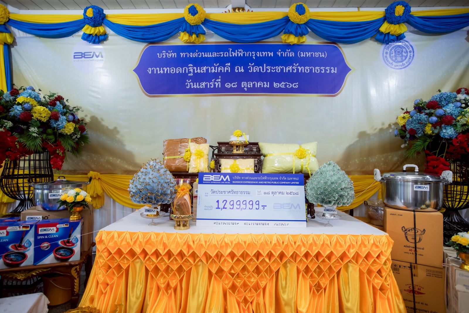 บริษัท ทางด่วนและรถไฟฟ้ากรุงเทพ จำกัด (มหาชน) หรือ BEM ร่วมกับชุมชนยิ้มประยูร ชุมชนปานทิพย์ ชุมชนสวนรื่น ชุมชนเสาหิน และผู้โดยสารรถไฟฟ้า MRT สร้างบุญมหากุศล สืบสานประเพณีทางพุทธศาสนา จัดงานทอดกฐินสามัคคี ประจำปี 2568 ณ วัดประชาศรัทธาธรรม (เสาหิน) เขตบางซื่อ โดยมี นายอนวัช สุวรรณฤทธิ์ รองกรรมการผู้จัดการ ให้เกียรติเป็นประธาน บรรยากาศภายในงานเปี่ยมไปด้วยพลังแห่งความศรัทธาของชุมชนในพื้นที่ คณะผู้บริหารและพนักงาน BEM ที่พร้อมใจกันมาร่วมสร้างกุศลในปีนี้