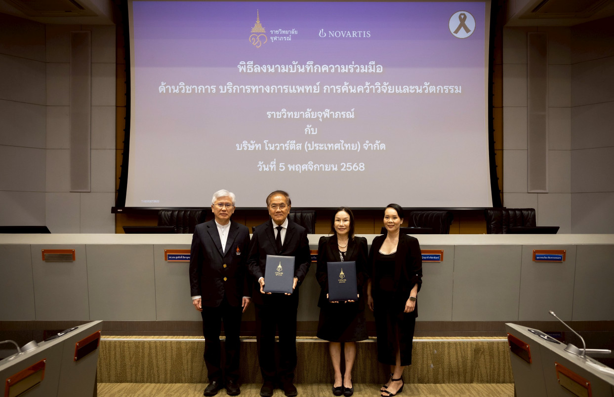 5 พฤศจิกายน 2568 : ราชวิทยาลัยจุฬาภรณ์ และบริษัท โนวาร์ตีส (ประเทศไทย) จำกัด ร่วมลงนามในบันทึกข้อตกลงความร่วมมือ (MOU) ทางด้านวิชาการ บริการทางการแพทย์ การค้นคว้าวิจัย และนวัตกรรม โดยมี ศาสตราจารย์เกียรติคุณ นายแพทย์รัชตะ รัชตะนาวิน รักษาการรองเลขาธิการราชวิทยาลัยจุฬาภรณ์ พร้อมด้วย รองศาสตราจารย์ นายแพทย์สุรศักดิ์ ลีลาอุดมลิปิ ผู้อำนวยการโรงพยาบาลจุฬาภรณ์ และ เภสัชกรหญิงสุมาลี คริสธานินทร์ ประธานบริหาร บริษัท โนวาร์ตีส (ประเทศไทย) จำกัด พร้อมด้วย คุณวรรณวิมล สินทราพรรณทร ผู้แทนของบริษัท โนวาร์ตีส (ประเทศไทย) จำกัด ร่วมลงนามในบันทึกข้อตกลงความร่วมมือดังกล่าว พร้อมกันนี้ คุณซัง ลี ผู้อำนวยการฝ่ายสื่อสารองค์กรและการสนับสนุนผู้ป่วย โนวาร์ติส ภาคพื้นเอเชียแปซิฟิคตะวันออกกลาง และแอฟริกา ร่วมกล่าวสุนทรพจน์ ภายในงาน พิธีดังกล่าวจัดขึ้น ณ ห้องประชุมใหญ่ ชั้น 3 อาคารสำนักงานราชวิทยาลัยจุฬาภรณ์ เขตหลักสี่ กรุงเทพมหานคร