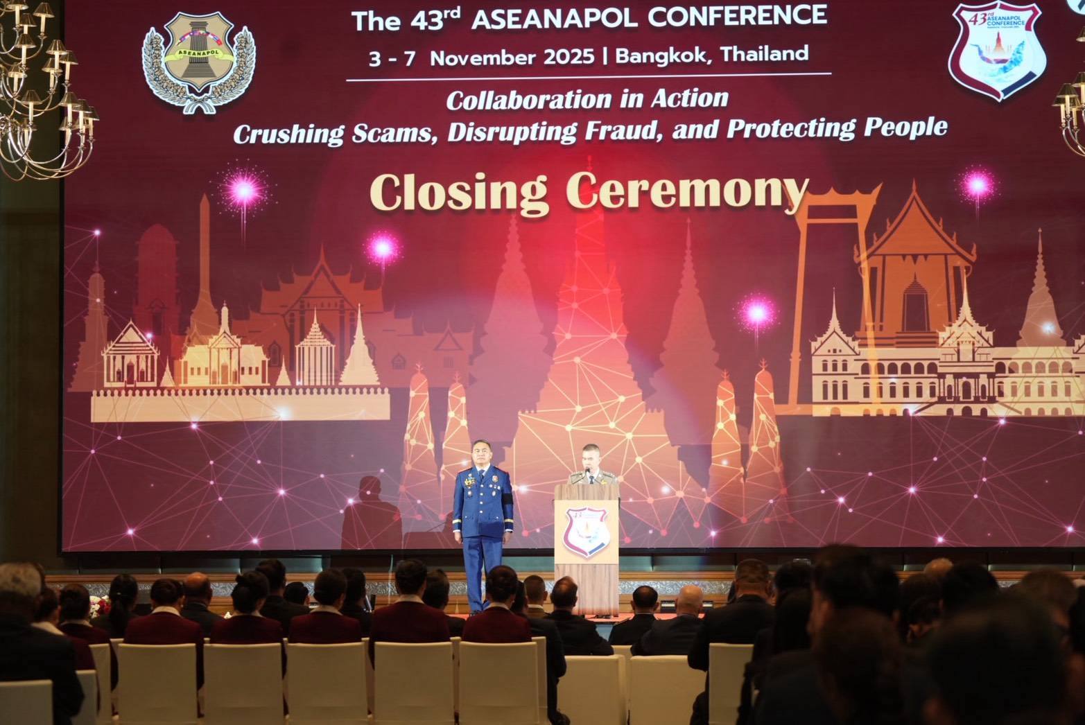ทั้งนี้ หัวหน้าตำรวจอาเซียนทั้ง 10 ประเทศ ได้ร่วมลงนามแถลงการณ์ร่วมการประชุมหัวหน้าตำรวจอาเซียน ครั้งที่ 43 โดยมีมติในการร่วมมือปราบปรามอาชญากรรมข้ามชาติ 8 ด้าน ได้แก่ การลักลอบค้ายาเสพติด, การลักลอบค้าอาวุธ, การก่อการร้าย, การค้ามนุษย์, อาชญากรรมเกี่ยวกับสัตว์ป่า, อาชญากรรมทางการเงิน, อาชญากรรมทางไซเบอร์ และอาชญากรรมทางทะเล โดยมุ่งเน้นการปราบปรามสแกมเมอร์ และการค้ามนุษย์