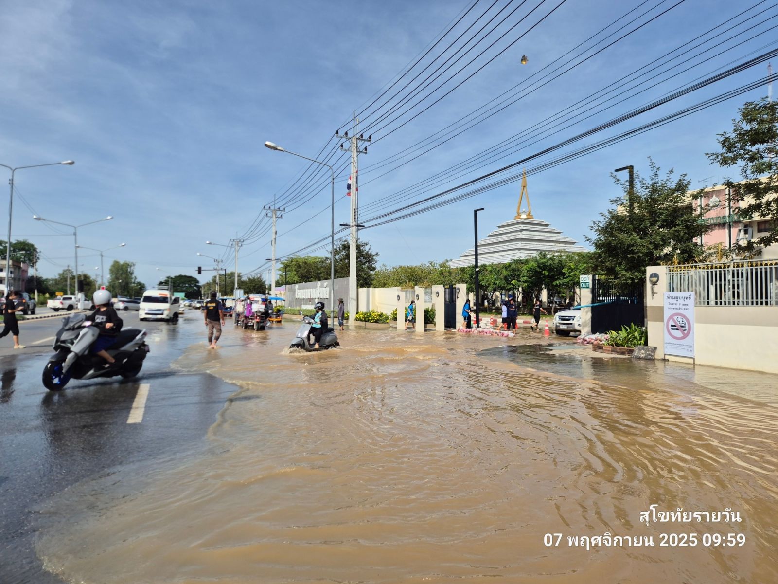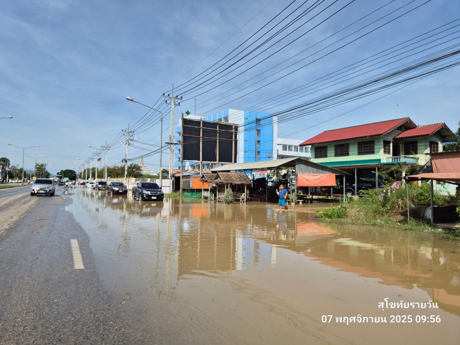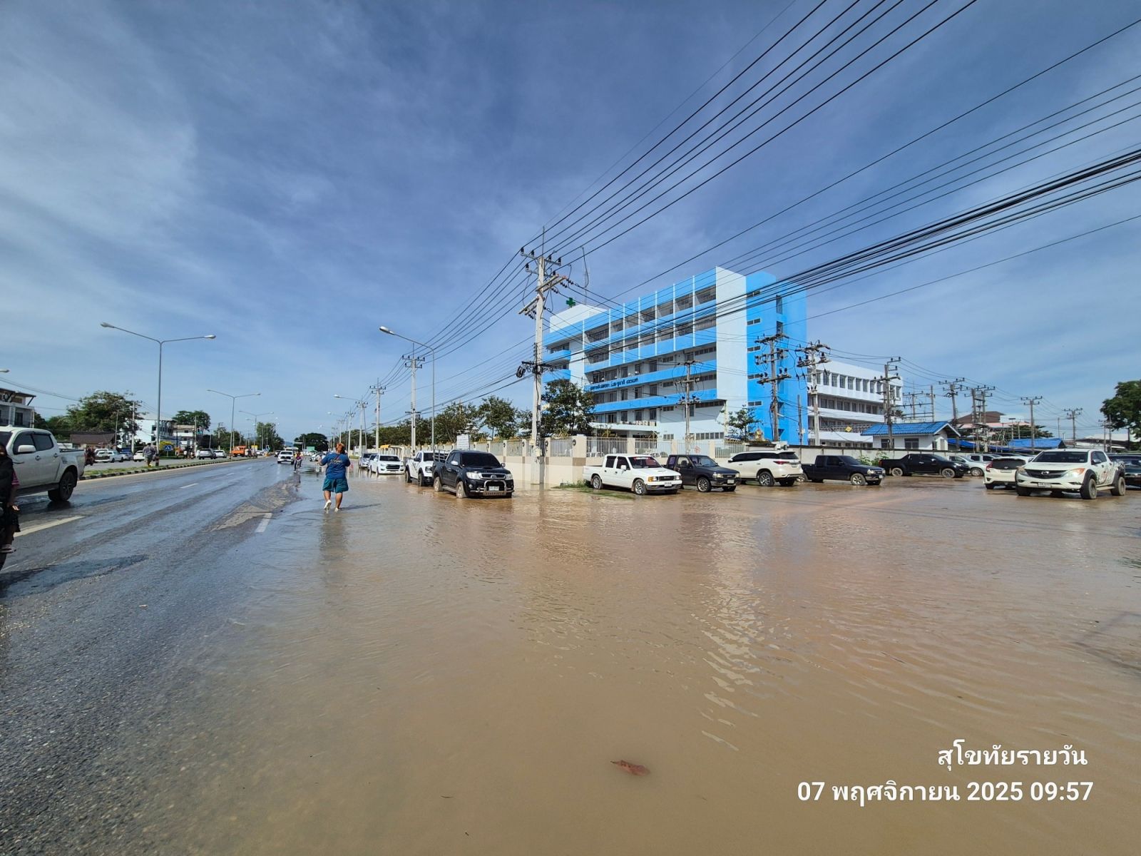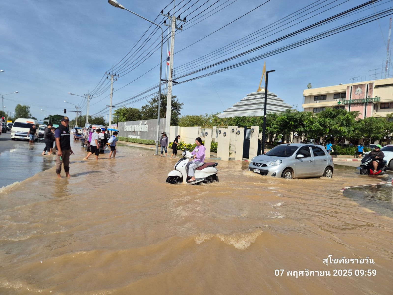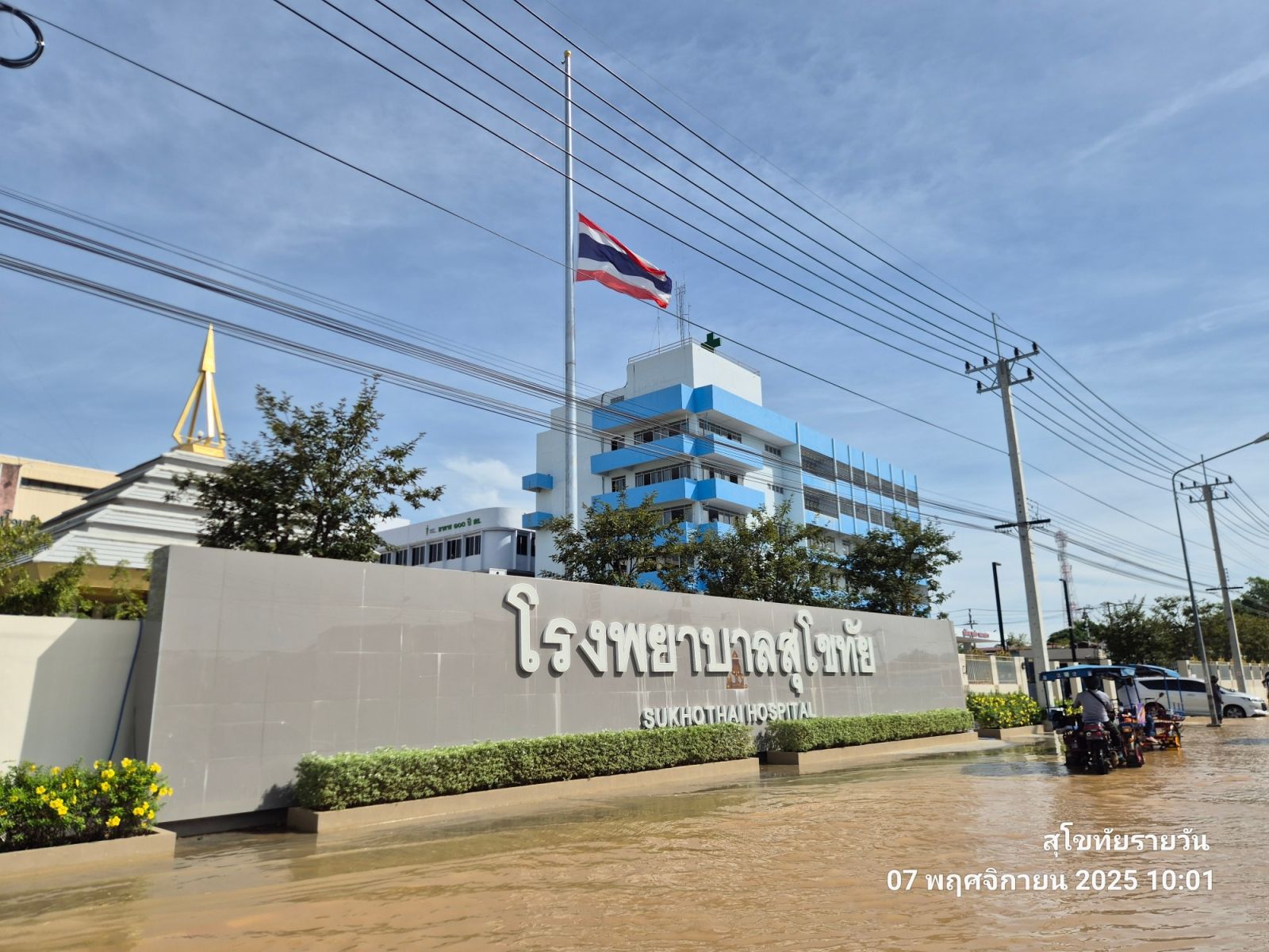 7 พฤศจิกายน 2568 บริเวณด้านหน้าโรงพยาบาลสุโขทัย เวลาประมาณ 10.00 น. ระดับน้ำท่วมสูง เอ่อล้นด้านหน้าโรงพยาบาล น้ำขึ้นจากท่อระบายน้ำฝั่งประตูทางออกของ รพ.สุโขทัย