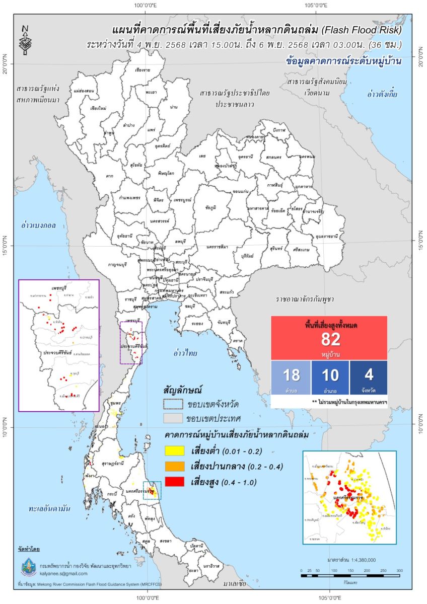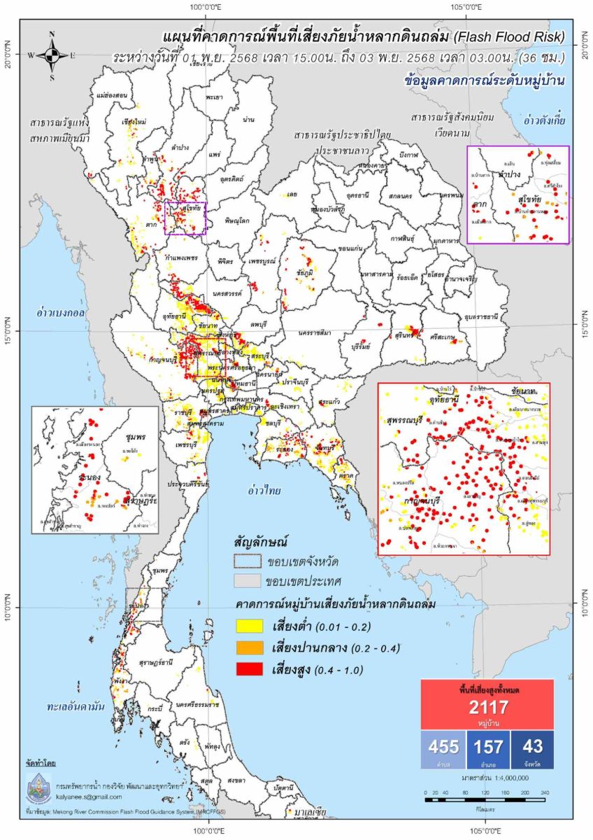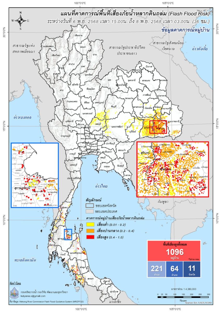 กองวิจัย พัฒนาและอุทกวิทยา แสดงแผนที่คาดการณ์พื้นที่เสี่ยงภัยน้ำหลากดินถล่ม (Flash Flood Risk) ระหว่างวันที่ 1 - 8 พฤศจิกายน 2568#กรมทรัพยากรน้ำ#กองวิจัยพัฒนาและอุทกวิทยา
