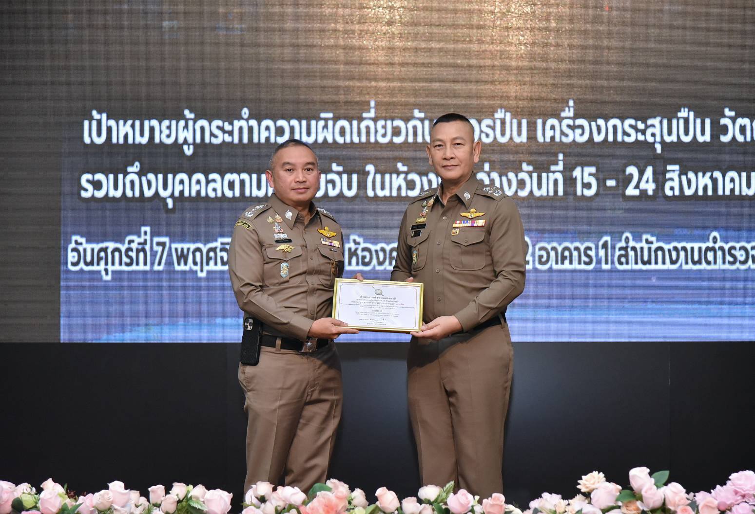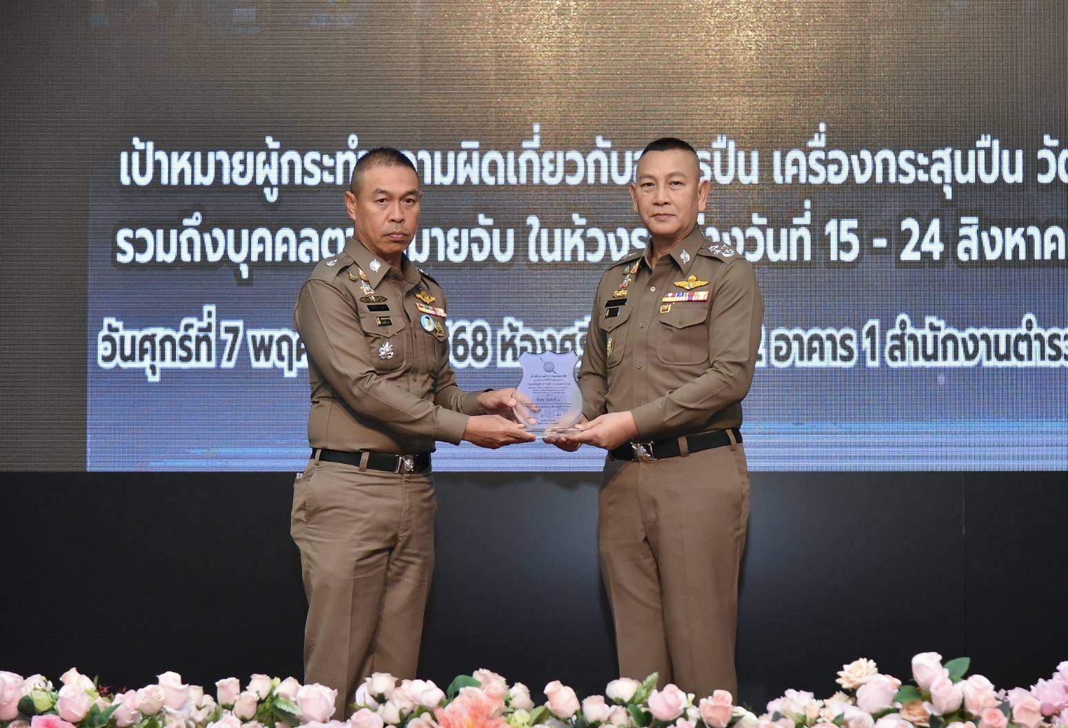 จากนั้น ผบ.ตร. มอบรางวัลให้แก่หน่วยงานที่มีผลการปฏิบัติดีเด่น และดี ด้านการจับกุมผู้กระทำความผิดเกี่ยวกับอาวุธปืน เครื่องกระสุนปืน และสืบสวนจับกุมบุคคลตามหมายจับ จากการระดมกวาดล้างอาชญากรรม ห้วงวันที่ 15 – 24 สิงหาคม 2568 ภายใต้แผนยุทธการ “พิชิตคนพาล อภิบาลคนดี” ซึ่งสำเร็จลุล่วงไปด้วยดี มีผลการปฏิบัติเป็นที่ประจักษ์ เพื่อเป็นขวัญกำลังใจให้แก่หน่วยงานและข้าราชการตำรวจที่ปฏิบัติหน้าที่อย่างเต็มกำลังความสามารถ