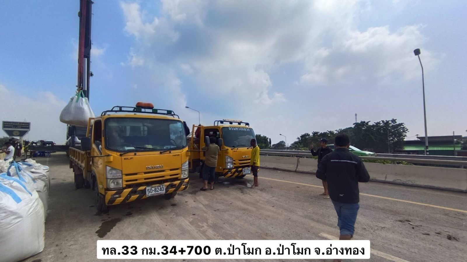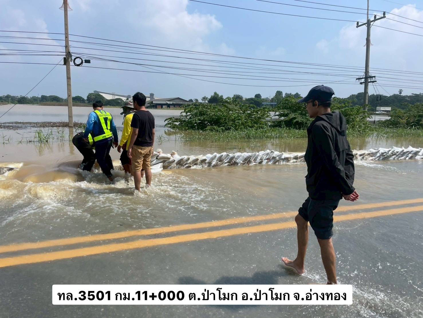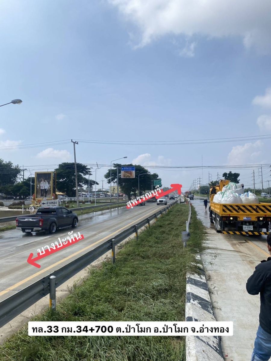 ในส่วนของการดูแลเส้นทางเลี่ยงน้ำท่วม บน ทล.3501 (อ่างทอง - บางหลวงโดด) ซึ่งเป็นเส้นทางเลาะริมแม่น้ำเจ้าพระยาฝั่งตะวันตก และได้รับผลกระทบบริเวณ กม.11+000 ซึ่งมีแนวโน้มที่ระดับน้ำจะไหลเข้าท่วมผิวจราจรได้ ทางเจ้าหน้าที่หมวดทางหลวงป่าโมกได้เข้าดำเนินการทันทีด้วยการวางแนวกระสอบกั้นน้ำที่มีความสูงประมาณ 20 เซนติเมตร ในระดับเสมอคันทาง และกำลังเร่งเสริมแนวกระสอบทรายและคันดิน เพื่อชะลอน้ำและรักษาพื้นผิวจราจรให้ใช้งานได้ โดยสถานการณ์ปัจจุบันเส้นทางนี้ยังสามารถสัญจรได้ตามปกติ และมีการจัดระบบการจราจรพร้อมป้ายแนะนำอย่างชัดเจน เพื่ออำนวยความสะดวกและดูแลความปลอดภัยของพี่น้องประชาชน