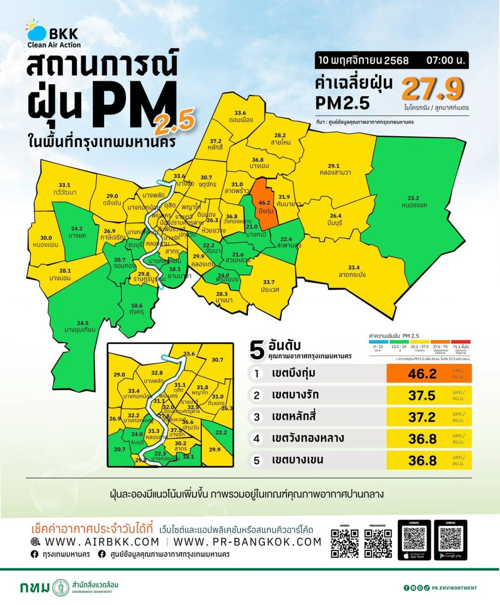 ศูนย์ข้อมูลคุณภาพอากาศกรุงเทพมหานคร ขอรายงานสถานการณ์ฝุ่นละอองขนาดไม่เกิน 2.5 ไมครอน (PM 2.5) ในกรุงเทพมหานคร ประจำวันที่ 10 พฤศจิกายน 2568 เวลา 07:00 น.