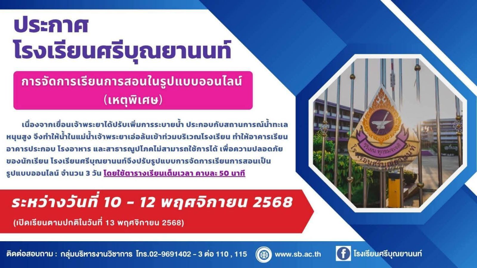นอกจากนี้ยังพบว่า โรงเรียนศรีบุณยานนท์ ซึ่งตั้งอยู่บนถนนนนทบุรี 1 ต.สวนใหญ่ อ.เมือง จ.นนทบุรี ได้ออกประกาศถึงนักเรียนและผู้ปกครอง เกี่ยวกับเรื่องการจัดการเรียนการสอนในรูปแบบออนไลน์ เป็นเหตุพิเศษ เนื่องจากน้ำท่วมพื้นที่โรงเรียน และทำให้อาคารเรียน โรงอาหาร และสาธารณูปโภคไม่สามารถใช้การได้ เพื่อความปลอดภัยของนักเรียน ทางโรงเรียนศรีบุณยานนท์จึงได้ปรับรูปแบบการจัดการเรียนการสอน เป็นรูปแบบออนไลน์ เป็นเวลา 3 วัน ระหว่างวันจันทร์ที่ 10 พฤศจิกายน – วันพุธที่ 12 พฤศจิกายน 2568 โดยใช้ตารางเรียนเต็มเวลา คาบละ 50 นาที และจะเปิดเรียนตามปกติอีกครั้งในวันพฤหัสบดีที่ 13 พฤศจิกายน 2568 เป็นต้นไป