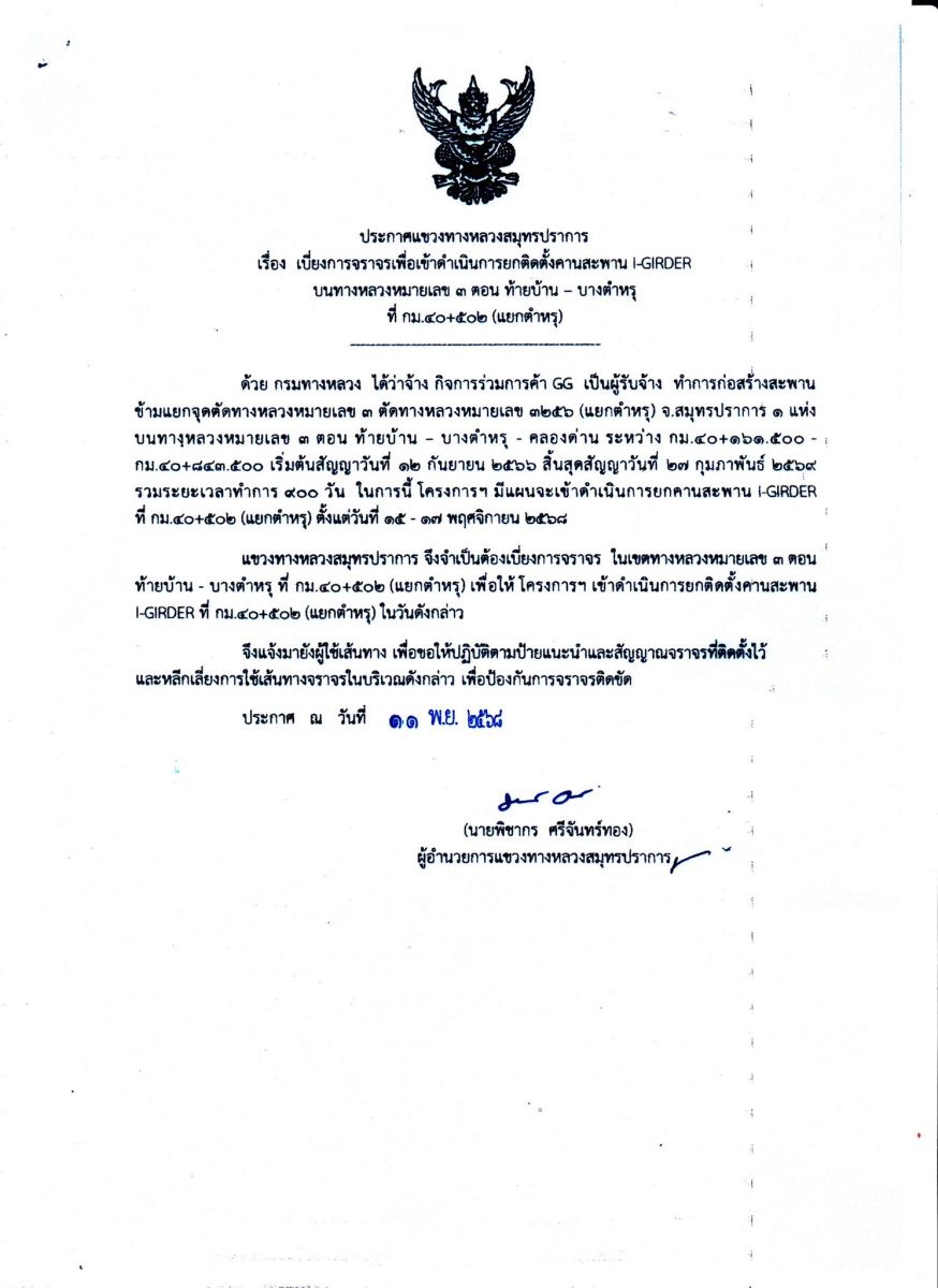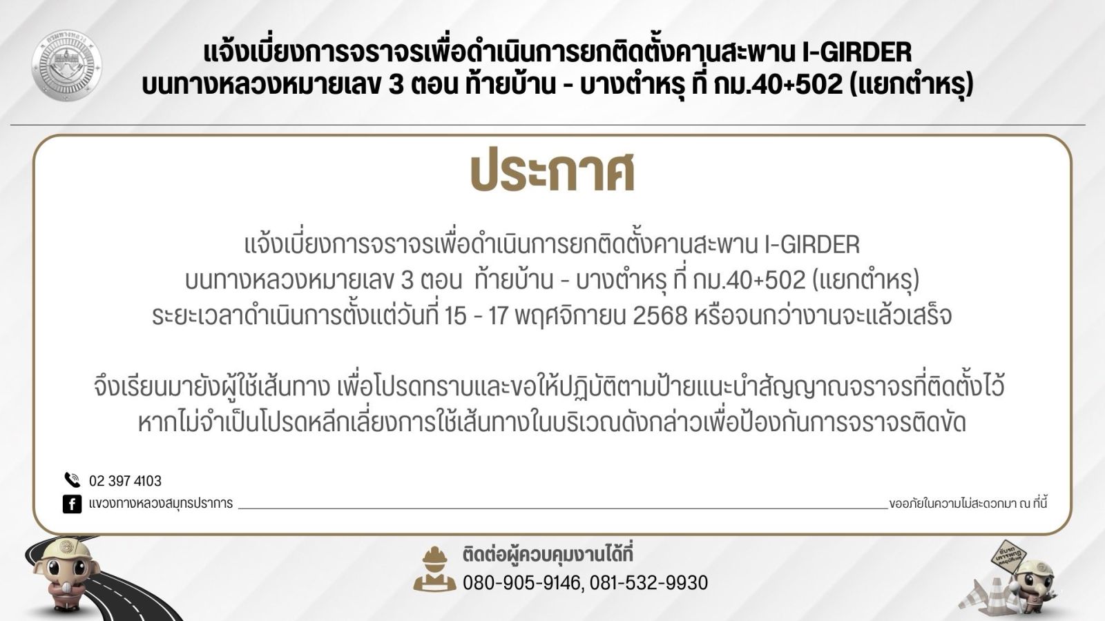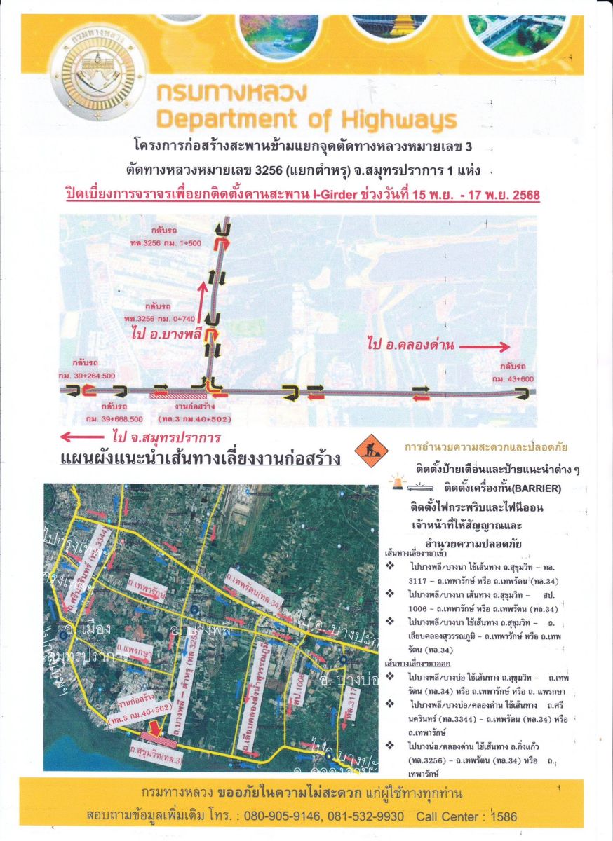 แขวงทางหลวงสมุทรปราการ ขอแจ้งให้ผู้ใช้ทางทราบว่า จะมีการปิดเบี่ยงการจราจรเพื่อดำเนินการยกติดตั้งคานสะพาน I-GIRDER บนทางหลวงหมายเลข 3 (ถนนสุขุมวิท) ตอน ท้ายบ้าน - บางตำหรุ ที่ กม.40+502 (แยกตำหรุ) ซึ่งในระหว่างการก่อสร้าง อาจจะมีการปิดจราจรเป็นบางช่วงชั่วคราว บริเวณ ที่ กม.40+502 (แยกตำหรุ) ระยะเวลาดำเนินการ ตั้งแต่วันที่ 15 - 17 พฤศจิกายน 2568 หรือจนกว่างานจะแล้วเสร็จ