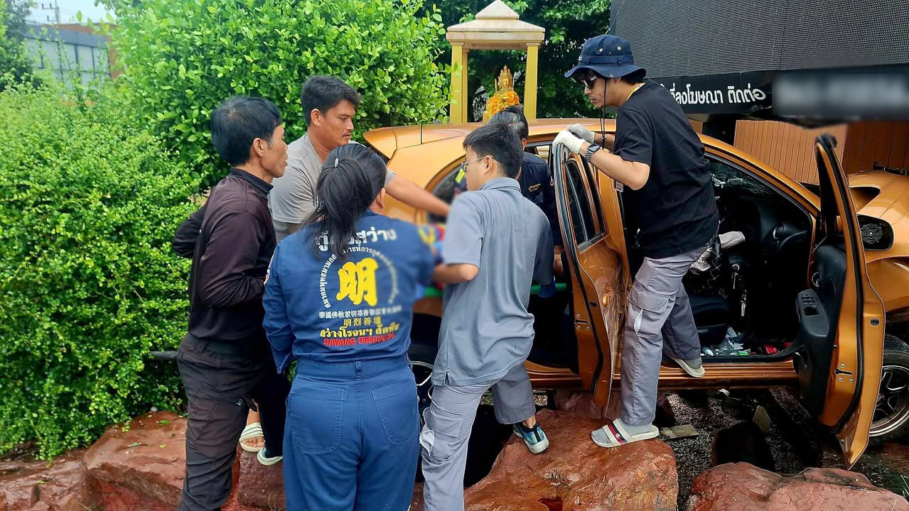 ที่เกิดเหตุพบ รถนั่งส่วนบุคคล นิสสัน มาร์ช สีส้ม ทะเบียน 7110 กรุงเทพมหานคร ลักษณะขึ้นไปบนฟุตบาท ชนอัดติดคาอยู่กับกองหินข้างร้านอาหาร หน้ารถพังเสียหาย ภายในรถพบ หญิงไทย อายุ 32 ปี คนขับ ได้รับบาดเจ็บ มีอาการปวดคอและหน้าอก ทางหน่วยกู้ภัย ได้ช่วยกันปฐมพยาบาล ก่อนเร่งนําตัวส่งรักษายังห้องฉุกเฉิน โรงพยาบาลวัดญาณสังวรารามฯ