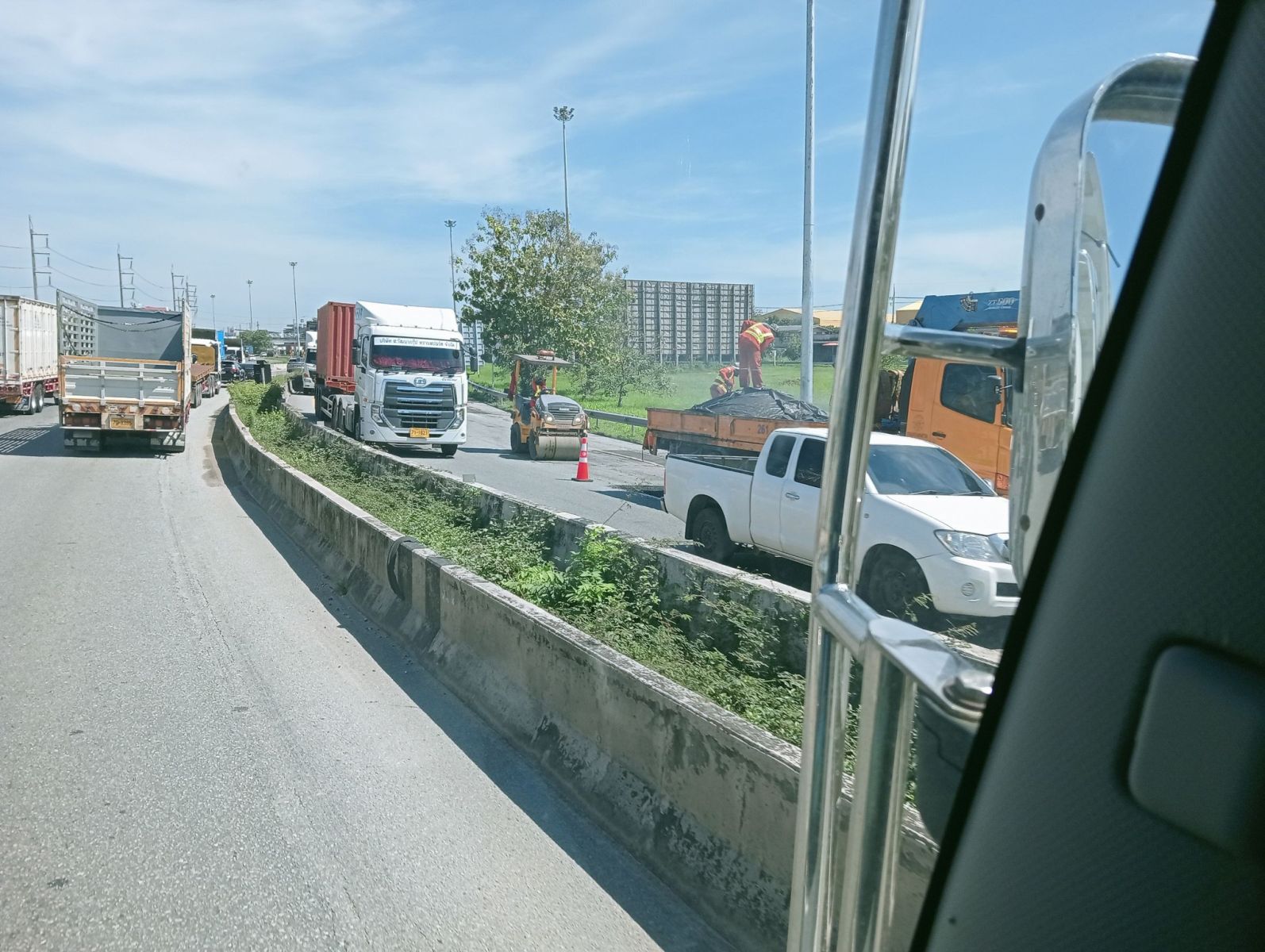 10.50 น. ถนนเลี่ยงเมืองชลบุรี มุ่งหน้าพัทยาเจ้าหน้าที่ซ่อมแซมผิวจราจรก่อนถึงสะพานหนองข้างคอกเช้านี้รถติดมาก ท้ายแถวเลยสะพานข้ามแยกบ้านบึง