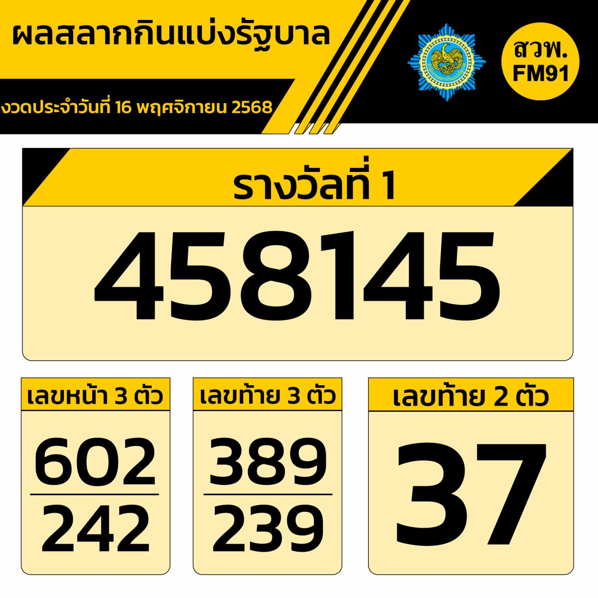 ผลการออกรางวัลสลากกินแบ่งรัฐบาล งวดประจำวันที่ 16 พฤศจิกายน 2568