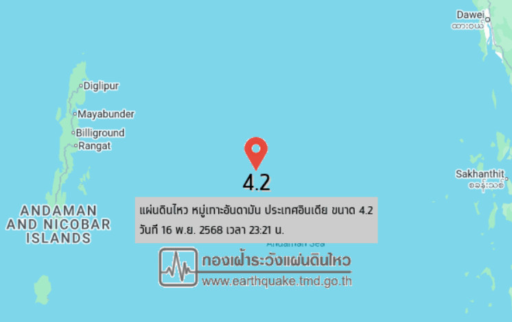 วันที่ 16 พ.ย. 2568 เวลา 23.21 น. กองเฝ้าระวังแผ่นดินไหว กรมอุตุนิยมวิทยา แจ้งเหตุ แผ่นดินไหว ขนาด 4.2 ความลึก 10 กม. บริเวณหมู่เกาะอันดามัน ประเทศอินเดีย (12.20°N,95.22°E) ศูนย์กลางห่างออกไปทางทิศตะวันตกเฉียงเหนือของ อ.เมืองชุมพร จ.ชุมพร ประมาณ 472 กม. ยังไม่มีรายงานผลกระทบต่อประเทศไทย