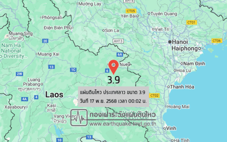 วันที่ 17 พ.ย. 2568 เวลา 00:02 น. กองเฝ้าระวังแผ่นดินไหว กรมอุตุนิยมวิทยา แจ้งเหตุ แผ่นดินไหว ขนาด 3.9 ความลึก 10 กม. ภายในพื้นที่ของประเทศลาว (20.12°N,104.20°E) ศูนย์กลางห่างออกไปทางทิศตะวันออกเฉียงเหนือของ ต.หอคำ อ.เมืองบึงกาฬ จ.บึงกาฬ ประมาณ 205 กม. ยังไม่มีรายงานผลกระทบต่อประเทศไทย