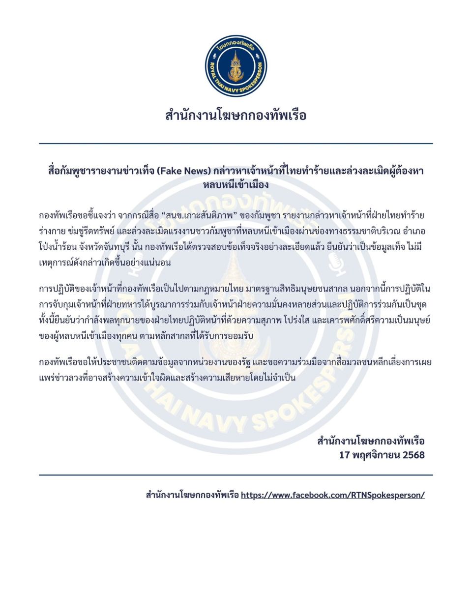 วันที่ 18 พฤศจิกายน 2568 เพจ โฆษกกองทัพเรือ Naval Spokesperson ได้ออกแถลงการณ์เป็นภาษาไทยและภาษาอังกฤษ รายละเอียดระบุว่า สื่อกัมพูชารายงานข่าวเท็จ (Fake News) กล่าวหาเจ้าหน้าที่ไทยทำร้ายและล่วงละเมิดผู้ต้องหา หลบหนีเข้าเมือง โดยระบุว่า