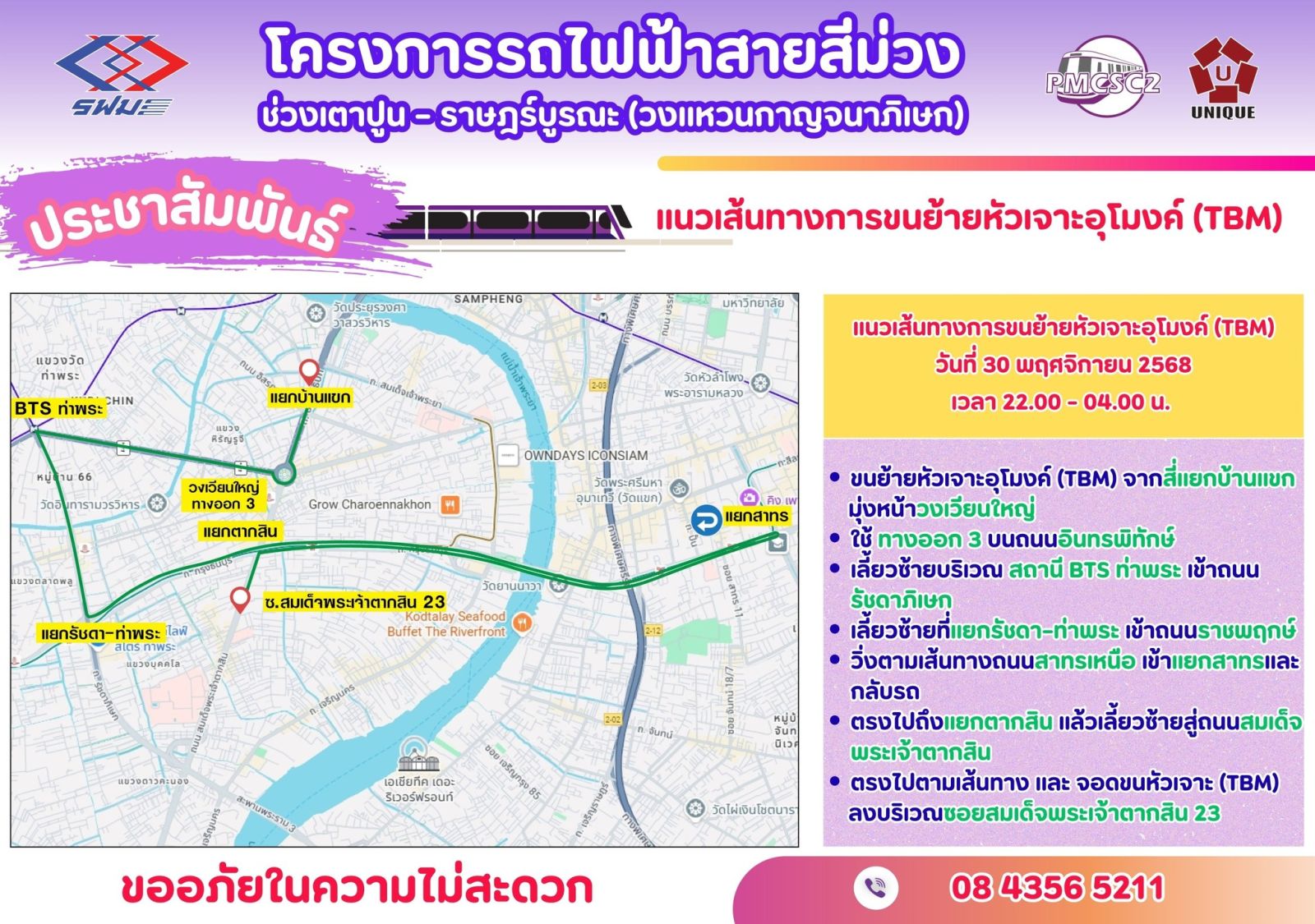 #ประชาสัมพันธ์ แนวเส้นทางขนย้ายหัวเจาะอุโมงค์ (TBM) โดย บริษัท ยูนิค เอ็นจิเนียริ่ง แอนด์ คอนสตรัคชั่น จำกัด (มหาชน) ผู้รับจ้างงานออกแบบและก่อสร้างอุโมงค์ทางวิ่งและสถานีใต้ดิน โครงการรถไฟฟ้าสายสีม่วง ช่วงเตาปูน - ราษฎร์บูรณะ (วงแหวนกาญจนาภิเษก) สัญญาที่ 4 ช่วงสะพานพุทธ - ดาวคะนอง ระหว่างวันที่ 30 พฤศจิกายน 2568 เวลา 22.00 – 04.00 น.