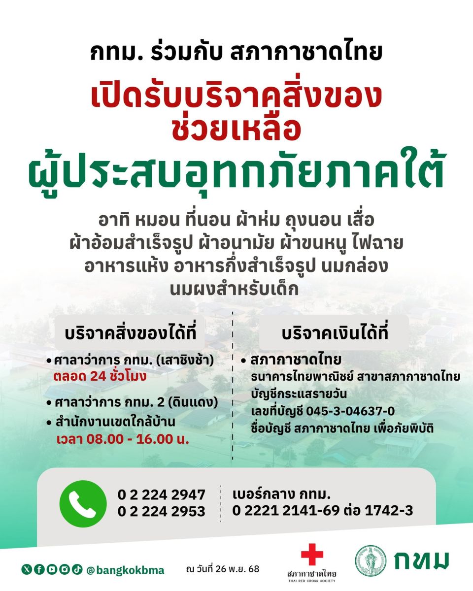 26 พ.ย. 68 นายณรงค์ เรืองศรี ปลัดกรุงเทพมหานคร เปิดเผยว่า กรุงเทพมหานครร่วมกับสภากาชาดไทย เปิดรับบริจาคสิ่งของจำเป็นเพื่อช่วยเหลือผู้ประสบอุทกภัยภาคใต้ โดยตั้งจุดรับบริจาค 52 จุด ทั่วกรุงเทพฯ จุดหลักที่ศาลาว่าการกรุงเทพมหานคร (เสาชิงช้า) เปิดรับตลอด 24 ชั่วโมง ส่วนจุดรับบริจาคที่ศาลาว่าการกรุงเทพมหานคร 2 (ดินแดง) และที่สำนักงานเขตทั้ง 50 เขต จะเปิดรับบริจาคทุกวัน ตั้งแต่เวลา 08.00 - 16.00 น. ทั้งนี้ สิ่งของที่กรุงเทพมหานครได้รับบริจาคมา จะส่งมอบให้กับสภากาชาดไทยเพื่อนำไปช่วยเหลือผู้ประสบภัยต่อไป