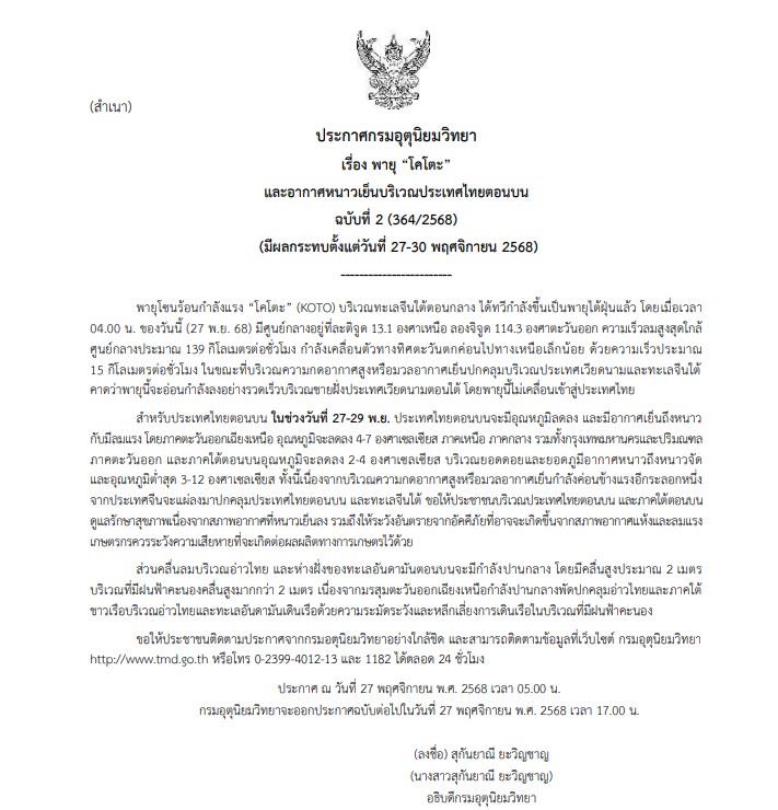 ประกาศกรมอุตุนิยมวิทยา เรื่อง พายุ “โคโตะ” และอากาศหนาวเย็นบริเวณประเทศไทยตอนบน ฉบับที่ 2 (มีผลกระทบตั้งแต่วันที่ 27-30 พฤศจิกายน 2568)