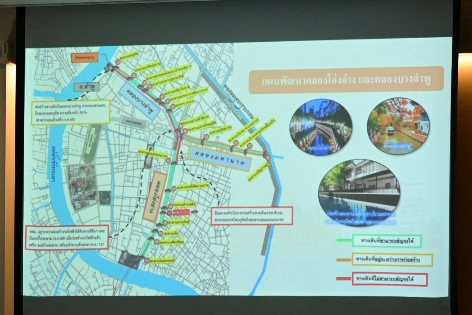 สำนักการระบายน้ำรายงานว่า งานก่อสร้างเขื่อนและขุดลอกคลองคืบหน้าเกือบทั้งหมด ส่วนทางเดินริมคลองบริเวณสะพานองค์อุทิศและทางลอดใต้ถนนสามเสนจะแล้วเสร็จกลาง ธ.ค. 68 พร้อมวางแผนสร้างทางลอดใต้สะพานผ่านฟ้าลีลาศ โดยเตรียมหาทางทำทางเดินชั่วคราวรองรับการใช้งานระหว่างก่อสร้างไปจนถึงปี 2570