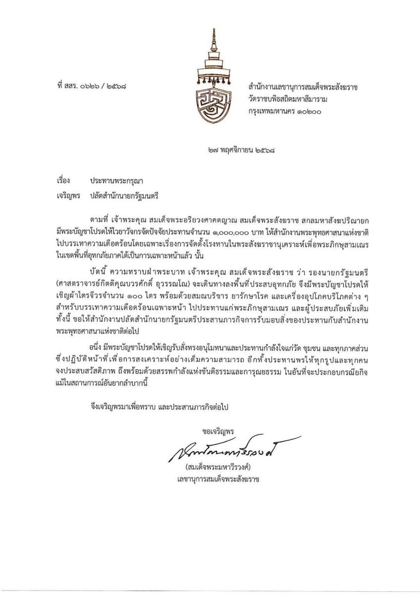บัดนี้ ความทราบฝ่าพระบาท เจ้าพระคุณ สมเด็จพระสังฆราช ว่า รองนายกรัฐมนตรี (ศาสตราจารย์กิตติคุณบวรศักดิ์ อุวรรณโณ) จะเดินทางลงพื้นที่ประสบอุทกภัย จึงมีพระบัญชาโปรดให้เชิญผ้าไตรจีวรจำนวน ๑๐๐ ไตร พร้อมด้วยสมณบริขาร ยารักษาโรค และเครื่องอุปโภคบริโภคต่างๆ สำหรับบรรเทาความเดือดร้อนเฉพาะหน้า ไปประทานแก่พระภิกษุสามเณร และผู้ประสบภัยเพิ่มเติม ทั้งนี้ ขอให้สำนักงานปลัดสำนักนายกรัฐมนตรีประสานภารกิจการรับมอบสิ่งของประทานกับสำนักงานพระพุทธศาสนาแห่งชาติต่อไป
