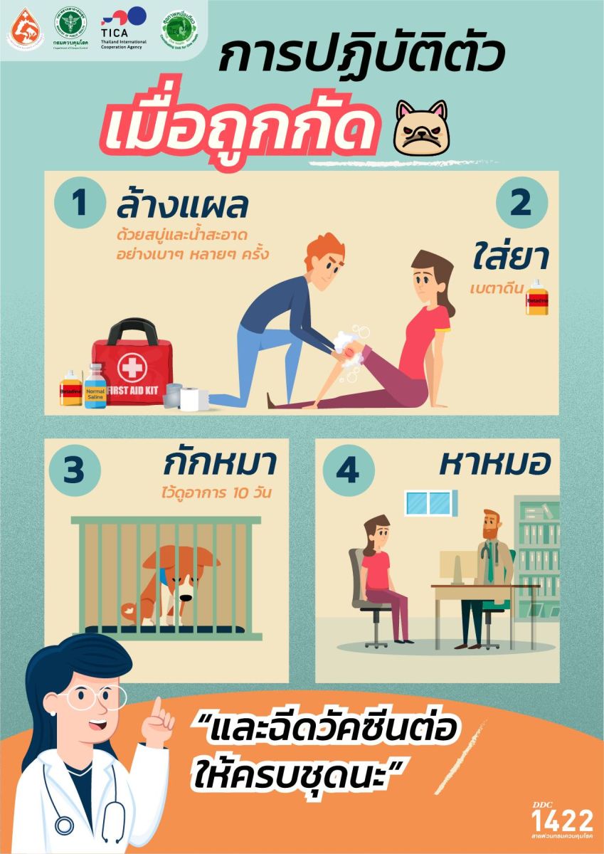 หากถูกกัดหรือสัมผัสสัตว์สงสัยโรคพิษสุนัขบ้า ให้ล้างแผลด้วยสบู่และรีบพบแพทย์ เพื่อรับวัคซีนป้องกันโรคพิษสุนัขบ้าทันที