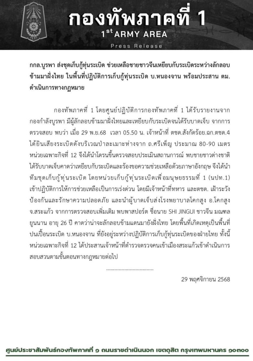 ด้านกองทัพภาคที่ 1 รายงานว่า ศูนย์ปฏิบัติการกองทัพภาคที่ 1 ได้รับรายงานจาก กองกำลังบูรพา มีผู้ลักลอบข้ามมาฝั่งไทยและเหยียบกับระเบิดจนได้รับบาดเจ็บ จากการตรวจสอบ พบว่า เมื่อ 29 พ.ย.68 เวลา 05.50 น. เจ้าหน้าที่ ตชด.สังกัดร้อย.ฉก.ตชด.4 ได้ยินเสียงระเบิดดังบริเวณป่าละเมาะห่างจาก ถ.ศรีเพ็ญ ประมาณ 80-90 เมตร หน่วยเฉพาะกิจที่ 12 จึงได้นำโดรนขึ้นตรวจสอบประเมินสถานการณ์ พบชายชาวต่างชาติ ได้รับบาดเจ็บคาดว่าเหยียบกับระเบิดและร้องขอความช่วยเหลือด้วยภาษาอังกฤษ จึงได้นำทีมชุดเก็บกู้ทุ่นระเบิด โดยหน่วยเก็บกู้ทุ่นระเบิดเพื่อมนุษยธรรมที่ 1 (นปท.1) เข้าปฏิบัติการให้การช่วยเหลือเป็นการเร่งด่วน โดยมีเจ้าหน้าที่ทหาร และตชด. เฝ้าระวังป้องกันและรักษาความปลอดภัย และนำผู้บาดเจ็บส่งโรงพยาบาลโคกสูง อ.โคกสูง