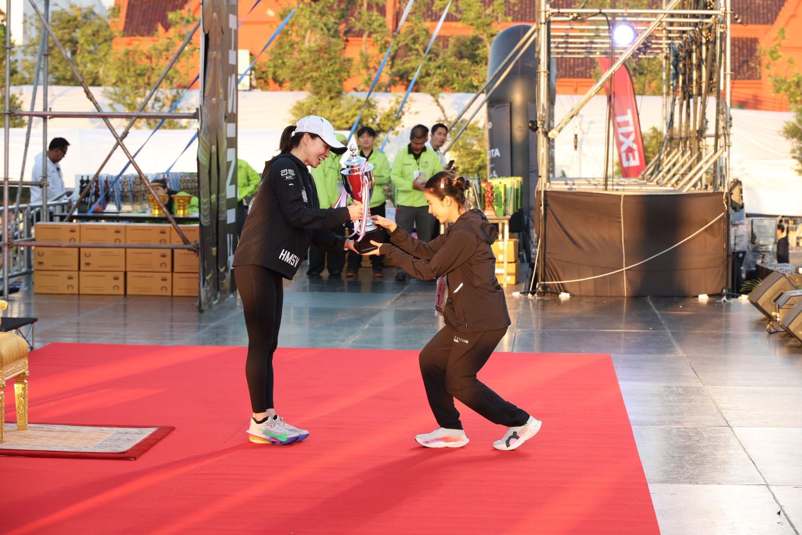 จากนั้นทรงพระดำเนินไปยัง พลับพลาพิธี ท้องสนามหลวง เพื่อพระราชทานถ้วยรางวัล แก่ผู้ชนะเลิศการแข่งขัน ระยะฮาล์ฟมาราธอน ๒๑.๑ กิโลเมตร จำนวน ๔ ราย ประกอบด้วยประเภทมืออาชีพ (อีลิทชาย) ๑ รางวัล ประเภทมืออาชีพ (อีลิทหญิง) ๑ รางวัล ประเภทบุคคลทั่วไป (ชายไทย) ๑ รางวัล ประเภทบุคคลทั่วไป (หญิงไทย) ๑ รางวัล และทรงฉายพระฉายาลักษณ์ร่วมกับนักวิ่งที่ชนะเลิศ คณะกรรมการจัดการแข่งขันฯ และผู้ให้การสนับสนุน ฯ ตามลำดับ