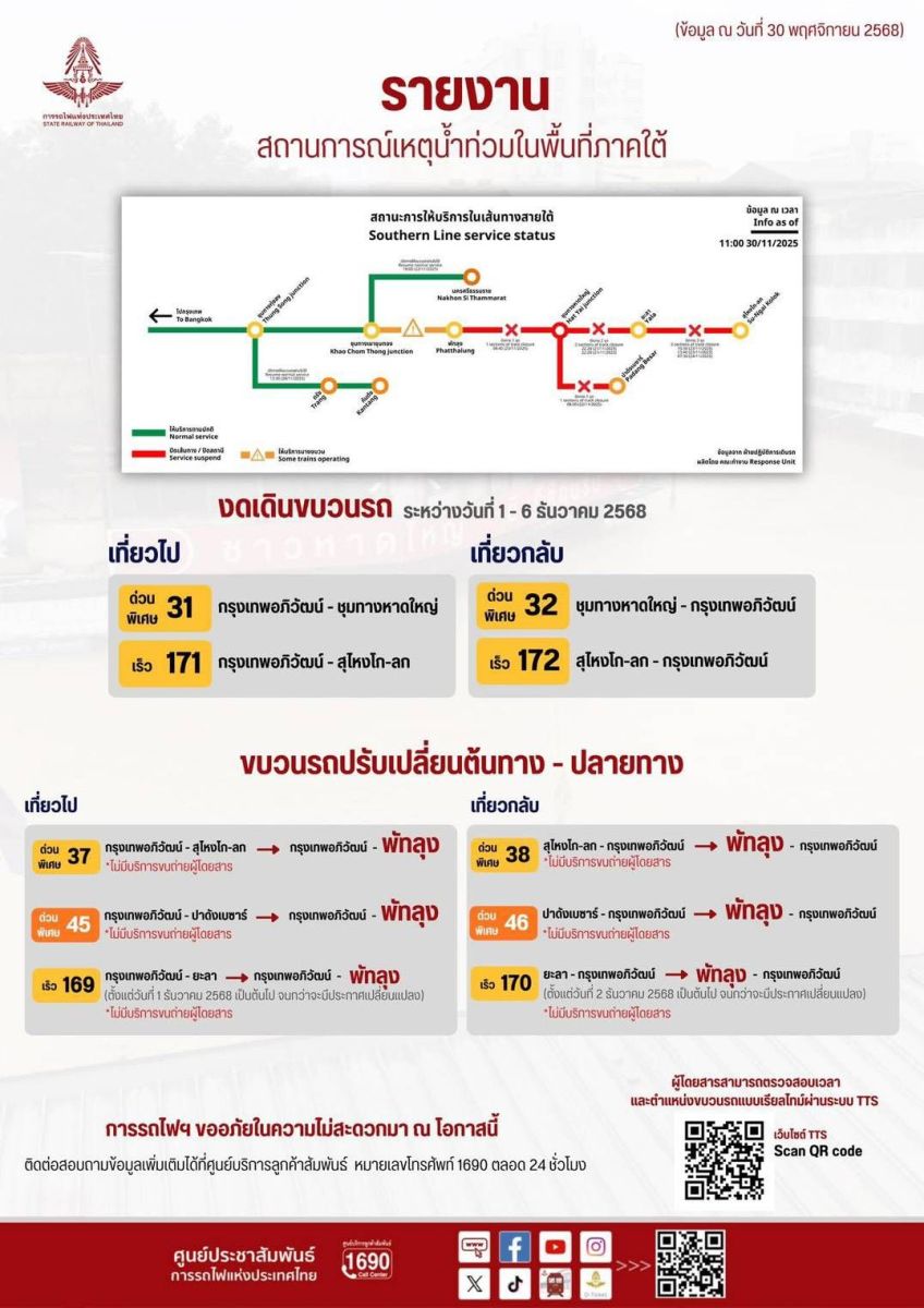 การรถไฟฯ จำเป็นต้องปิดทาง เพื่อดำเนินการซ่อมแซม และฟื้นฟูสภาพทางรถไฟที่ได้รับความเสียหาย เพื่อให้สามารถกลับมาใช้งานได้ตามปกติโดยเร็ว พร้อมแจ้งปรับเปลี่ยนขบวนรถ จำนวน 6 ขบวน และงดเดินขบวนรถอีก 4 ขบวน เพื่อให้สามารถเปิดให้บริการได้อย่างปลอดภัยสูงสุด ตั้งแต่วันนี้ - 6 ธันวาคม 2568 ดังนี้.-