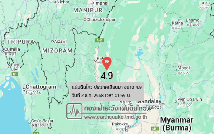 วันที่ 2 ธ.ค. 2568 เวลา 01.55 น.กองเฝ้าระวังแผ่นดินไหว กรมอุตุนิยมวิทยา แจ้งเหตุ แผ่นดินไหว ขนาด 4.9 ความลึก 10 กม. ภายในพื้นที่ของประเทศเมียนมา (22.90°N,94.38°E) ศูนย์กลางห่างออกไปทางทิศตะวันตกเฉียงเหนือของ อ.เมือง จ.แม่ฮ่องสอน ประมาณ 547 กม. ยังไม่มีรายงานผลกระทบต่อประเทศไทย