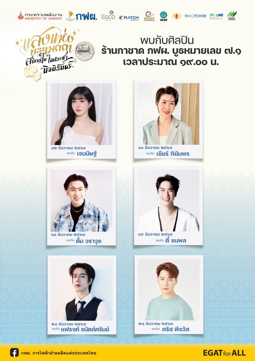 การไฟฟ้าฝ่ายผลิตแห่งประเทศไทย (กฟผ.) ขอเชิญชวนประชาชนร่วมเที่ยวชมร้านกาชาด กฟผ. ภายในงานกาชาดประจำปี 2568 ภายใต้แนวคิด “แสงแห่งพระเมตตา สถิตในใจประชานิจนิรันดร์” ชมนิทรรศการเส้นทางแห่งพระเมตตา พระราชกรณียกิจเพื่อราษฎร ร่วมทำเวิร์คชอปพวงมาลัยและริบบิ้นดำไว้อาลัย พร้อมชวนสอยดาวลุ้นรับสร้อยคอทองคำหนัก 25 สตางค์ เครื่องใช้ไฟฟ้าเบอร์ 5 และของรางวัลอื่น ๆ อีกมากมาย มาชอปชิมเครื่องดื่มจากร้านกาแฟคุณสายชล ร่วมชมดนตรีบรรเลงเพลงพระราชนิพนธ์ และพบกับศิลปินชื่อดัง อาทิ เจนนิษฐ์ โอ่ประเสริฐ เชียร์ ฑิฆัมพร ตั้ม วราวุธ ตี๋ ธนพล แฟรงค์ ธนัตถ์ศรันย์ และ คริส พีรวัส