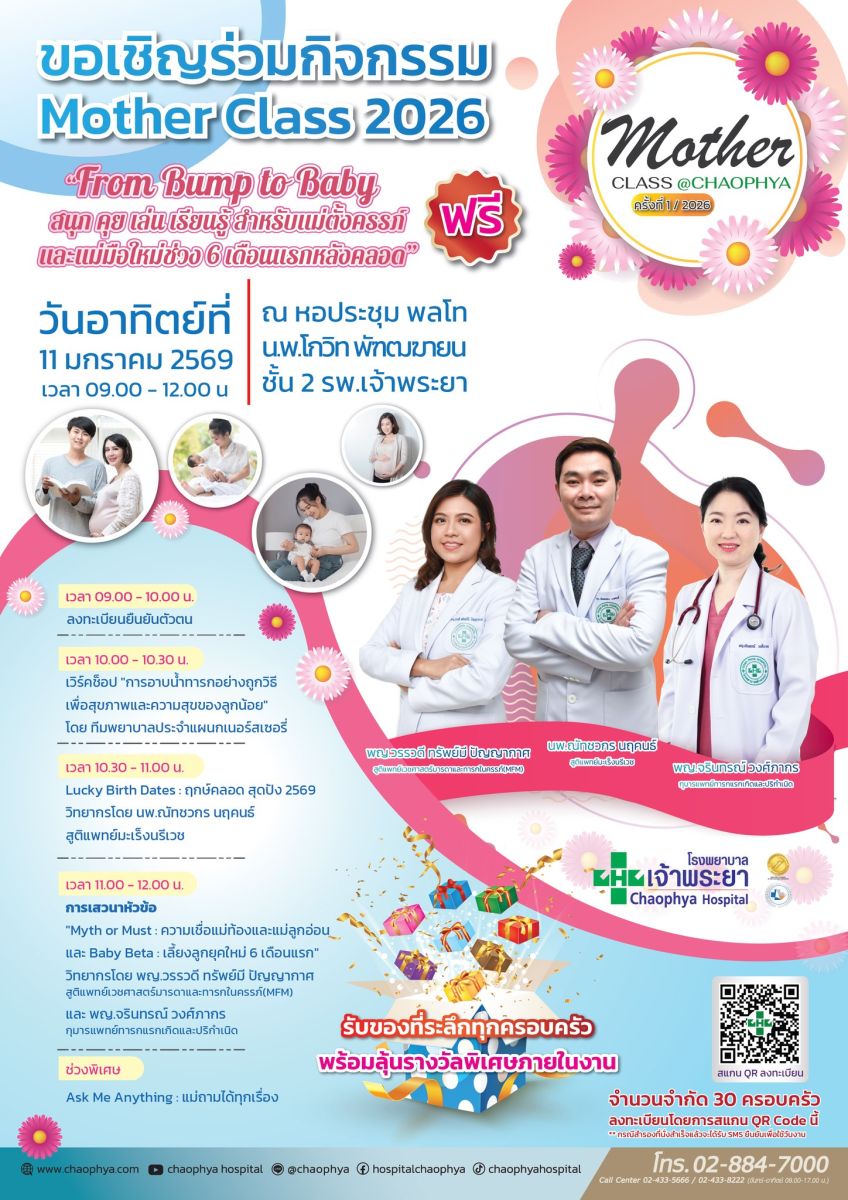 รพ.เจ้าพระยาขอเรียนเชิญคุณแม่ตั้งครรภ์ทุกท่าน และครอบครัวที่มีลูกเล็กวัย 0-6 เดือน ที่สนใจสมัครเข้าร่วมโครงการ “Mother Class @Chaophya” ครั้งที่ 1/2026 ไม่เสียค่าใช้จ่ายใดๆ พร้อมรับของที่ระลึกภายในงาน จำนวนจำกัด 30 ครอบครัว