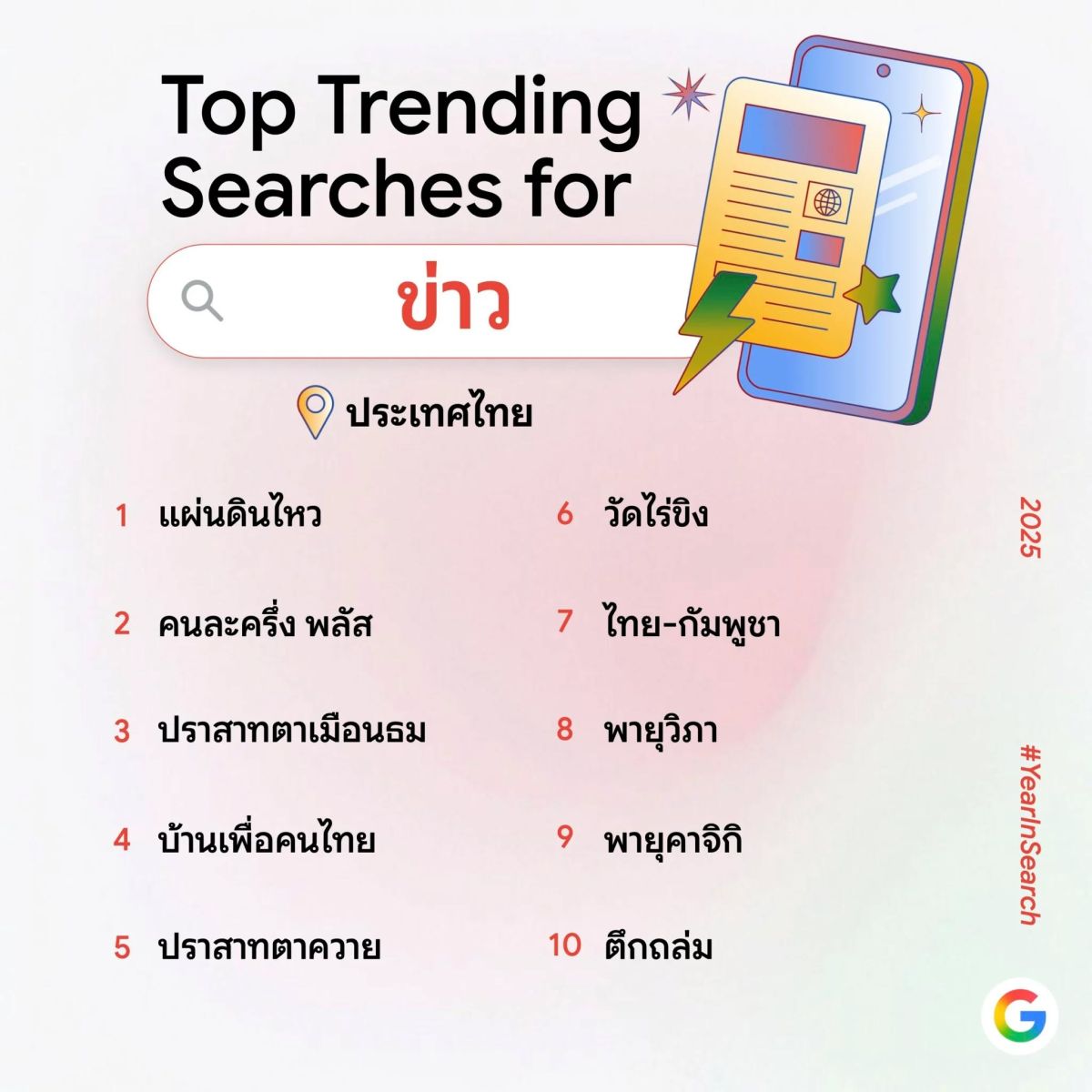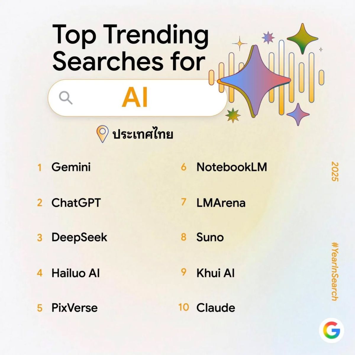4 ธันวาคม 2568 ผู้สื่อข่าวรายงาน Google ประเทศไทย เปิดเผยรายงาน "Year in Search 2025" หรือ สุดยอดคำค้นหาประจำปี 2568 ซึ่งเป็นการประมวลภาพรวมความสนใจของคนไทยตลอดทั้งปี โดยปีนี้พบการเปลี่ยนแปลงที่น่าสนใจ เมื่อเทคโนโลยีปัญญาประดิษฐ์ (AI) กลายเป็นเรื่องใกล้ตัวและทรงอิทธิพลที่สุด โดยคำว่า Gemini ขึ้นครองแชมป์อันดับ 1 คำค้นหายอดนิยมประจำปี สะท้อนให้เห็นว่าคนไทยตื่นตัวและนำ AI มาประยุกต์ใช้ในชีวิตประจำวันอย่างแพร่หลาย ไม่เพียงแค่ Gemini แต่เครื่องมืออย่าง ChatGPT และ DeepSeek ก็ติดอยู่ใน 10 อันดับแรกเช่นกัน