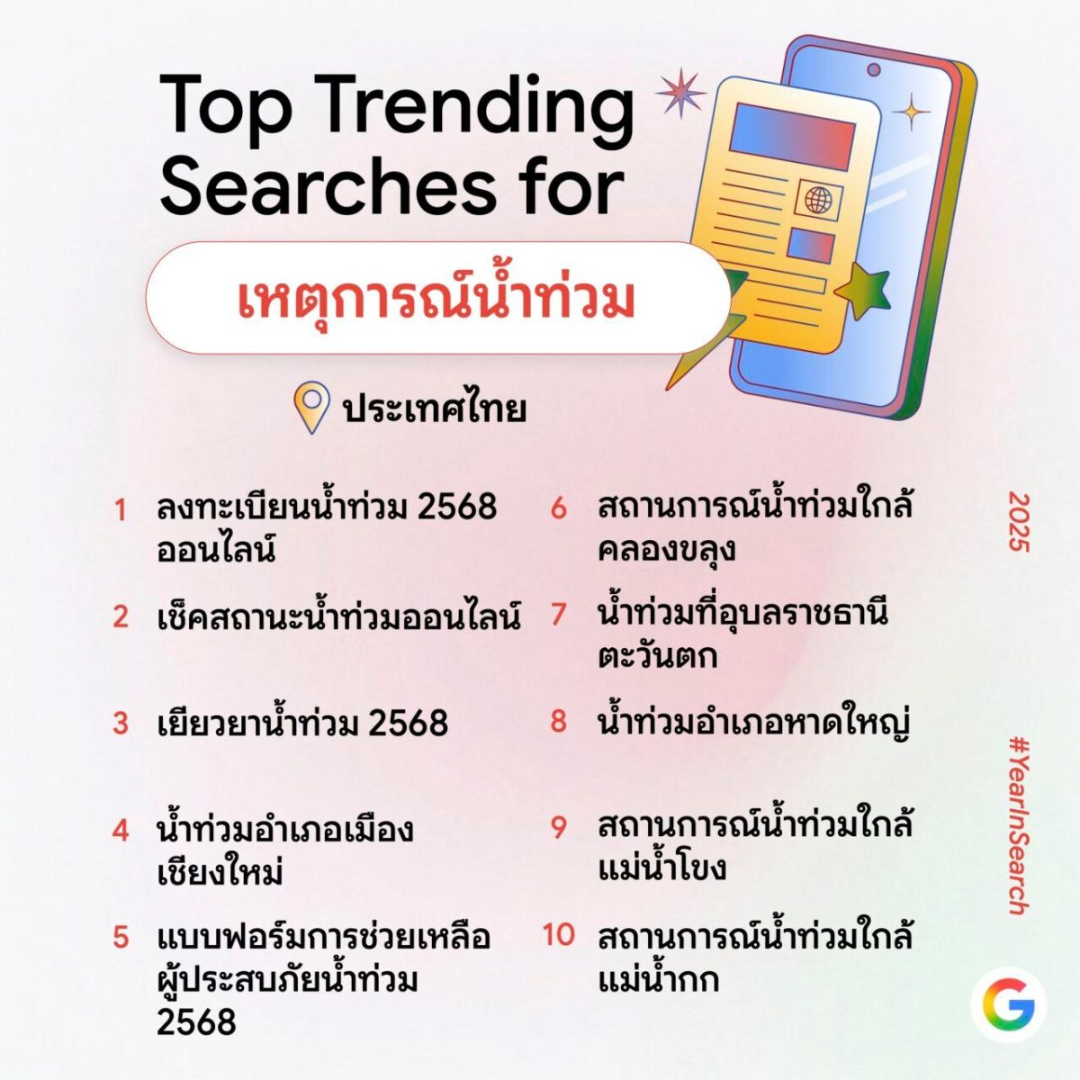 ความกังวลของคนไทยต่อสถานการณ์น้ำท่วมในหลายพื้นที่ของประเทศ ซึ่งส่งผลต่อชีวิตประจำวันทั้งการเดินทาง และความปลอดภัยสะท้อนผลอย่างชัดเจน โดย "ลงทะเบียนน้ำท่วม 2568 ออนไลน์" ครองอันดับ 1 คำค้นหายอดนิยมหมวดเหตุการณ์น้ำท่วม ตามด้วย "เช็คสถานะน้ำท่วมออนไลน์" "เยียวยาน้ำท่วม 2568" "น้ำท่วมอำเภอเมืองเชียงใหม่" "แบบฟอร์มการช่วยเหลือผู้ประสบภัยน้ำท่วม 2568" ในอันดับ 2- 5 ตามลำดับ และล่าสุด "น้ำท่วมอำเภอหาดใหญ่" ซึ่งเป็นเหตุการณ์ที่เกิดขึ้นได้ไม่นาน ก็พุ่งขึ้นมาติดโผใน 10 อันดับแรกอย่างรวดเร็ว