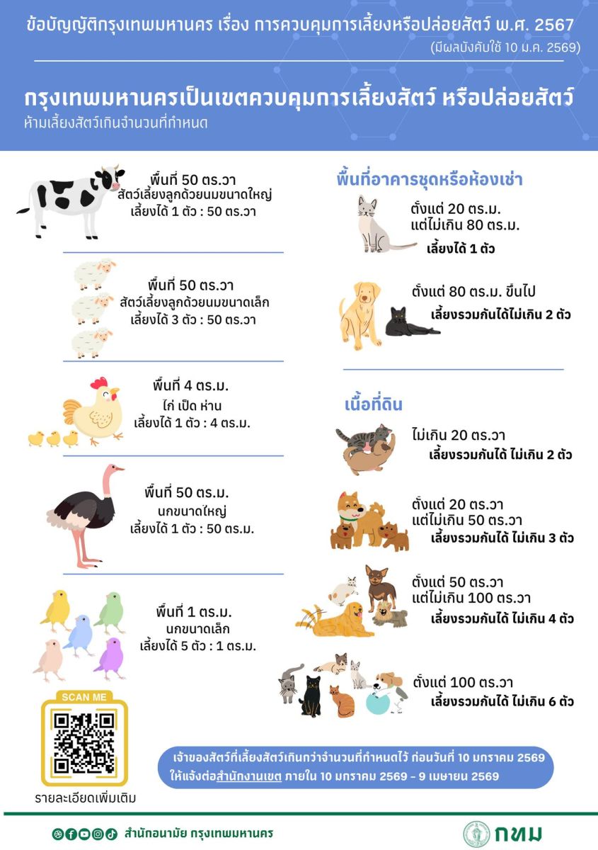สำหรับข้อบัญญัติกรุงเทพมหานคร เรื่อง การควบคุมการเลี้ยงหรือปล่อยสัตว์ พ.ศ. 2567 ได้ประกาศในราชกิจจานุเบกษาเมื่อวันที่ 25 มกราคม 2568 และจะมีผลบังคับใช้ในวันที่ 10 มกราคม 2569 ที่จะถึงนี้ ซึ่ง กทม. ได้มีการเตรียมความพร้อมในด้านต่าง ๆ อาทิ การพัฒนาระบบการจดทะเบียนสัตว์เลี้ยงอิเล็กทรอนิกส์ การหารือร่วมกับหน่วยงานที่เกี่ยวข้อง NGOs และภาคเอกชน รวมถึงจัดทำสื่อประชาสัมพันธ์เพื่อสร้างความเข้าใจแก่ประชาชน